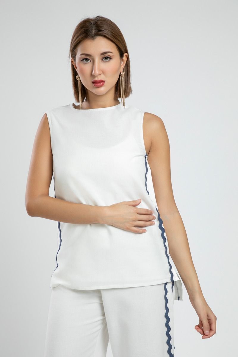 Elevate your style with this sleeveless women's blouse featuring an asymmetrical cut and delicate wavy thread detailing along the sides. Designed with a round neckline and back button closure for a sleek modern finish.