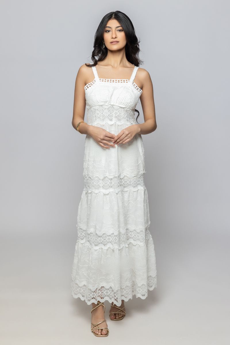 Crafted in a solid color, the dress features a beautifully detailed knitted crochet design along with intricate embroidery, adding a touch of texture and sophistication.