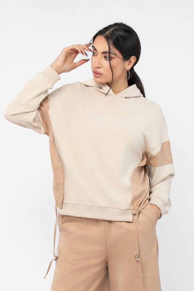 contrats colored women hoodie with drawstring on waistline