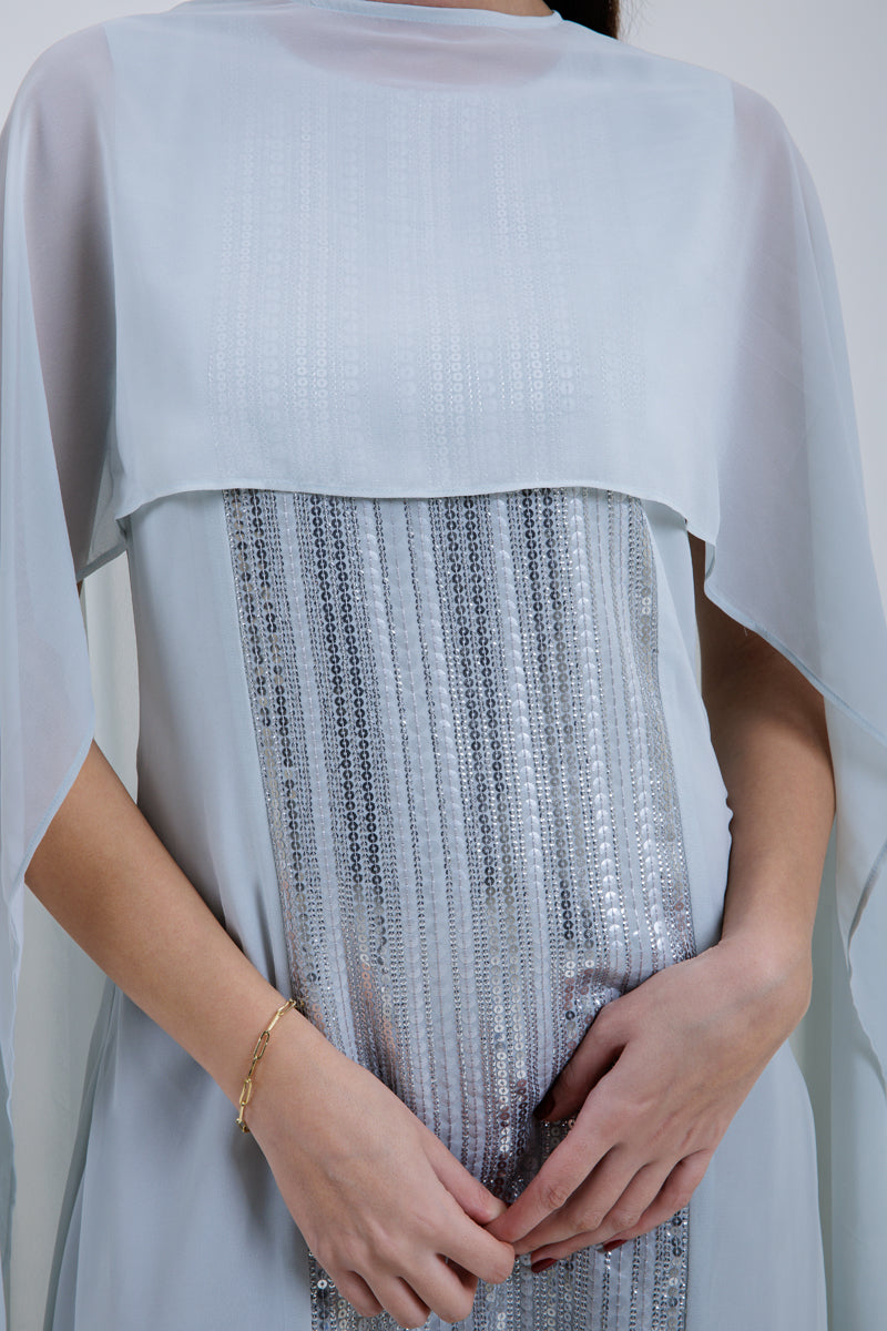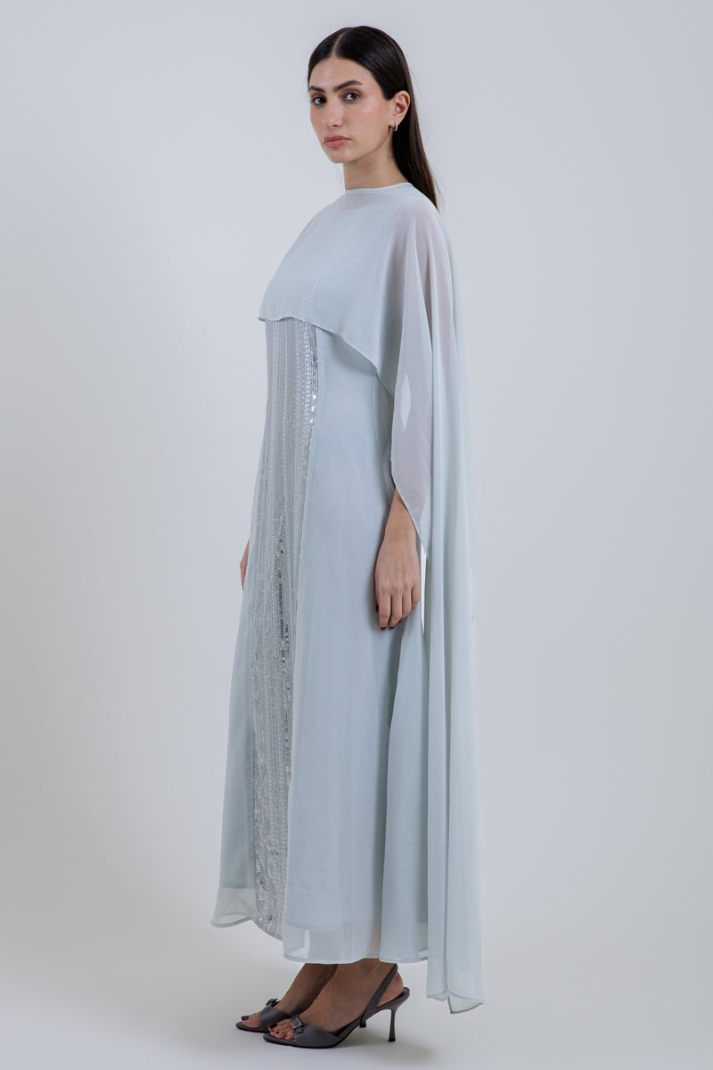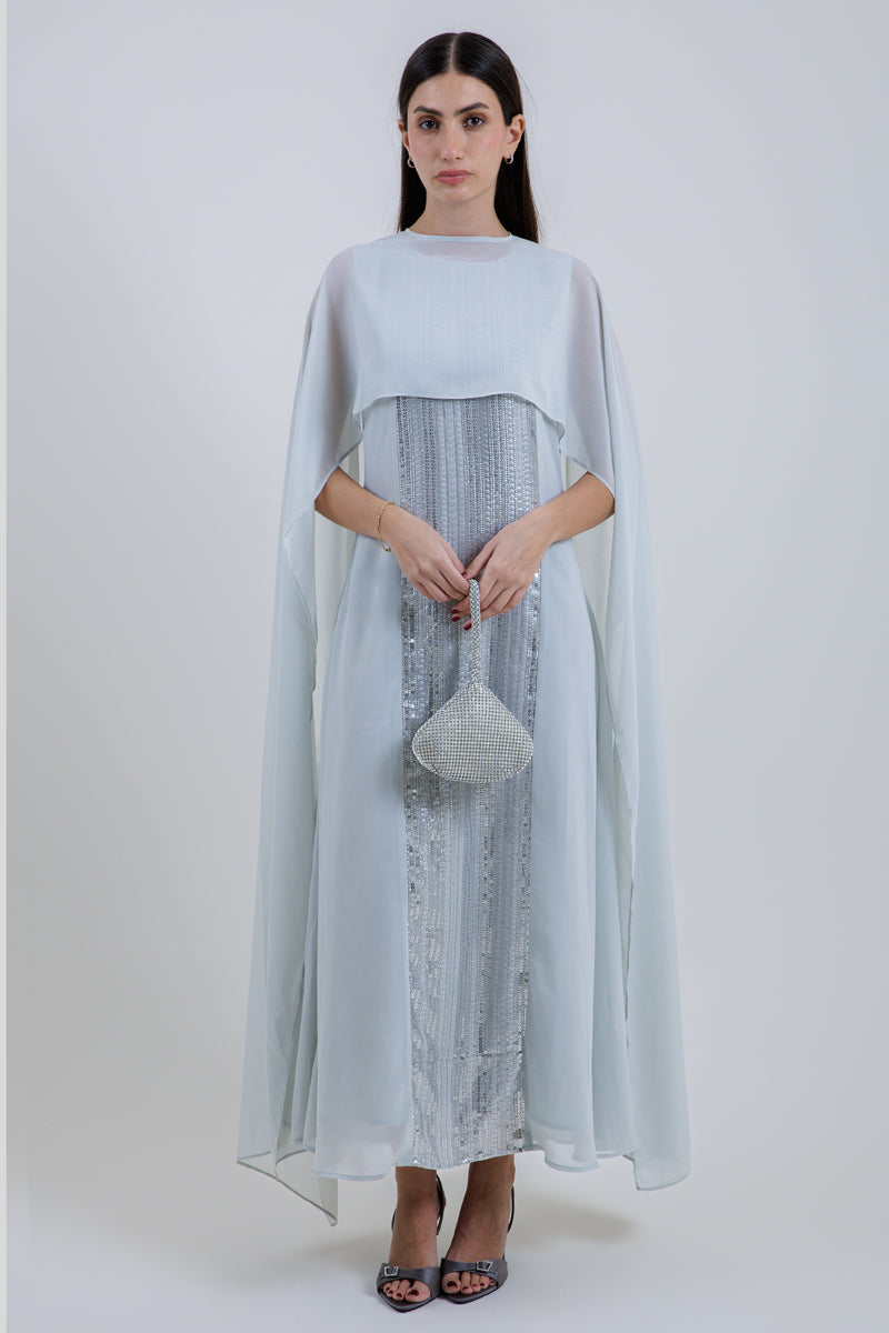 A one-piece maxi dress featuring an attached flowing cape overlay for an elegant silhouette. Designed with a central embellished panel and a relaxed fit, offering a refined and graceful look ideal for special occasions