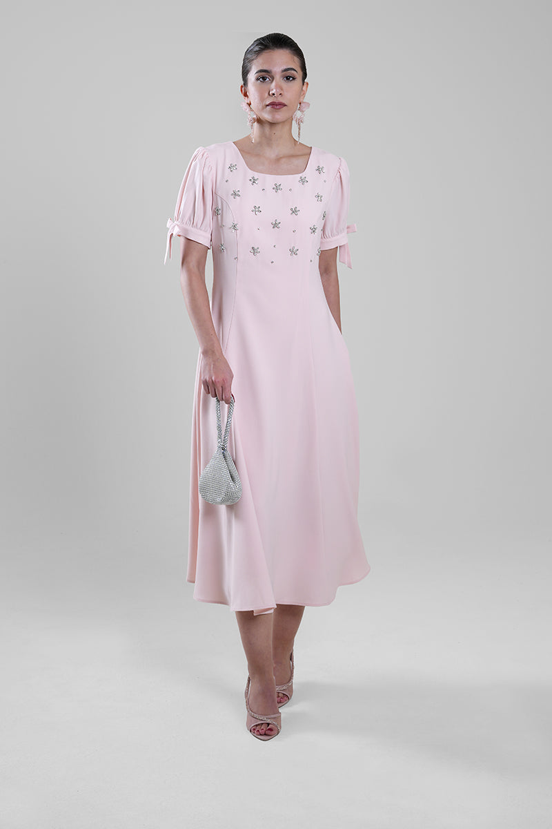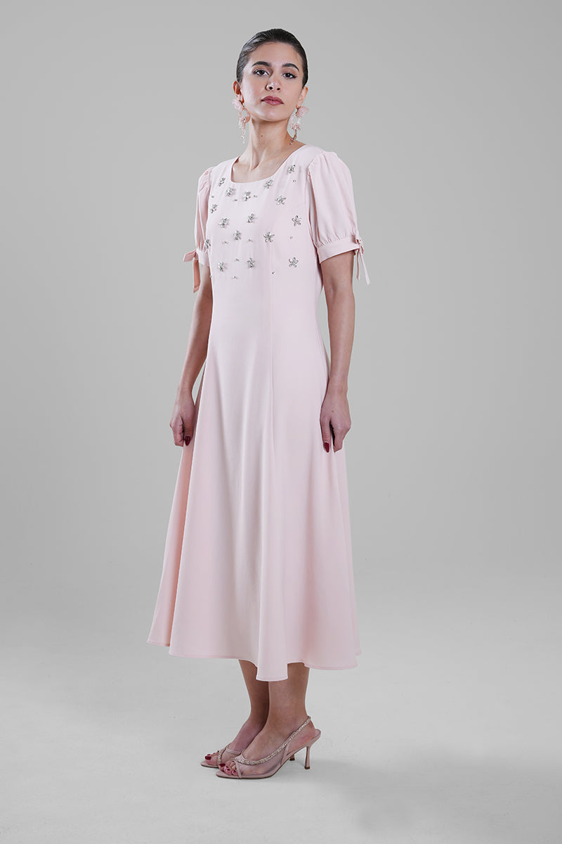 A midi dress designed with delicate embellishment details across the bodice. Features short puff sleeves with subtle tie accents and a softly flowing silhouette that offers ease of movement. Refined and versatile, suitable for elegant daytime or evening wear.