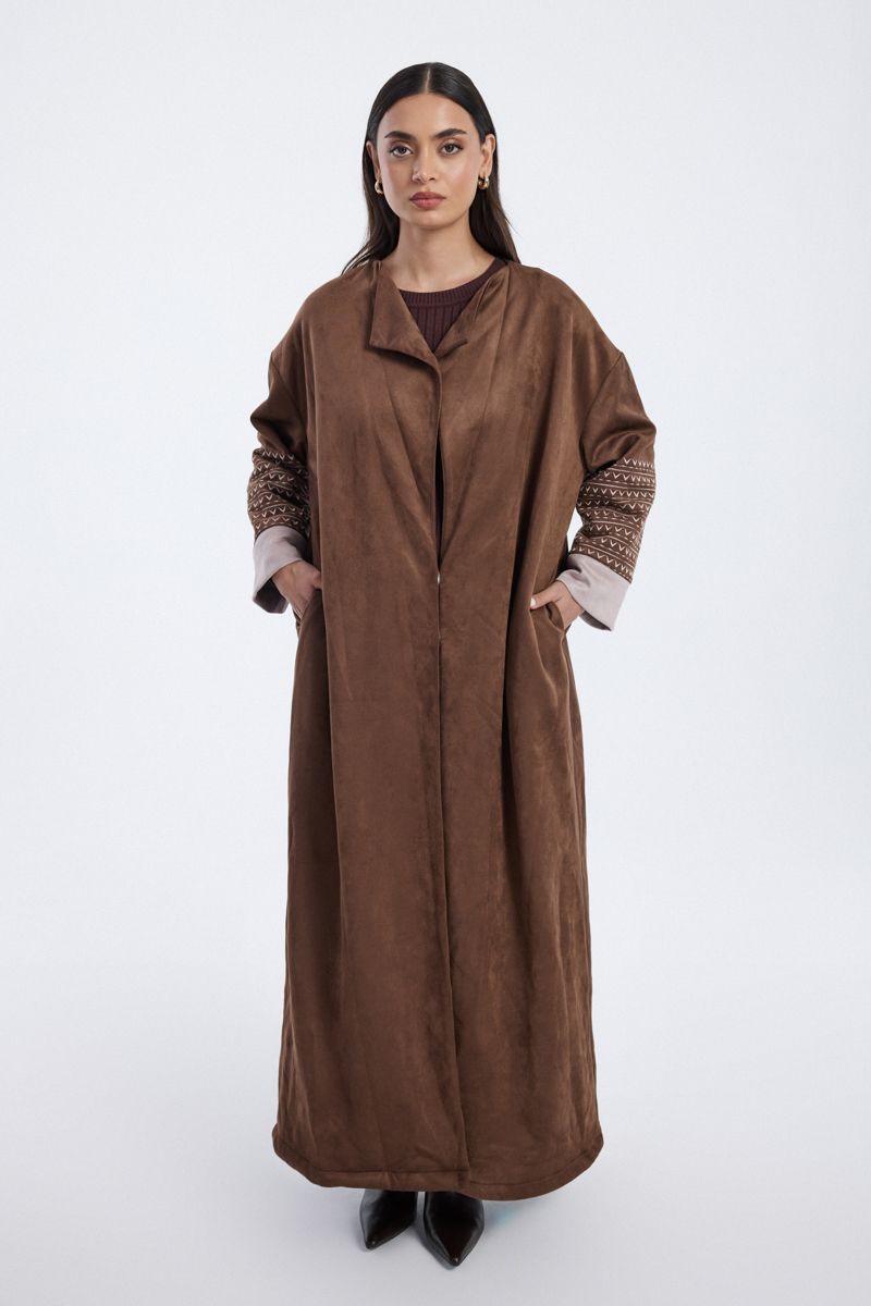 Stylish longline farwa designed with a soft suede touch finish for warmth and elegance. Features wide sleeves enriched with detailed embroidery and contrasting turned cuffs. The relaxed silhouette and open front style make it a versatile outerwear piece that blends traditional charm with modern sophistication.