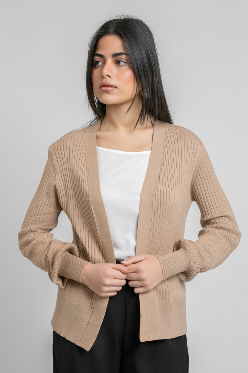 A women open front cardigan crafted from soft knitted fabric with a ribbed texture for a flattering fit. Designed with long sleeves and a comfortable stretch for easy layering over tops and blouses. Perfect for casual days or smart-casual styling, offering both warmth and elegance.