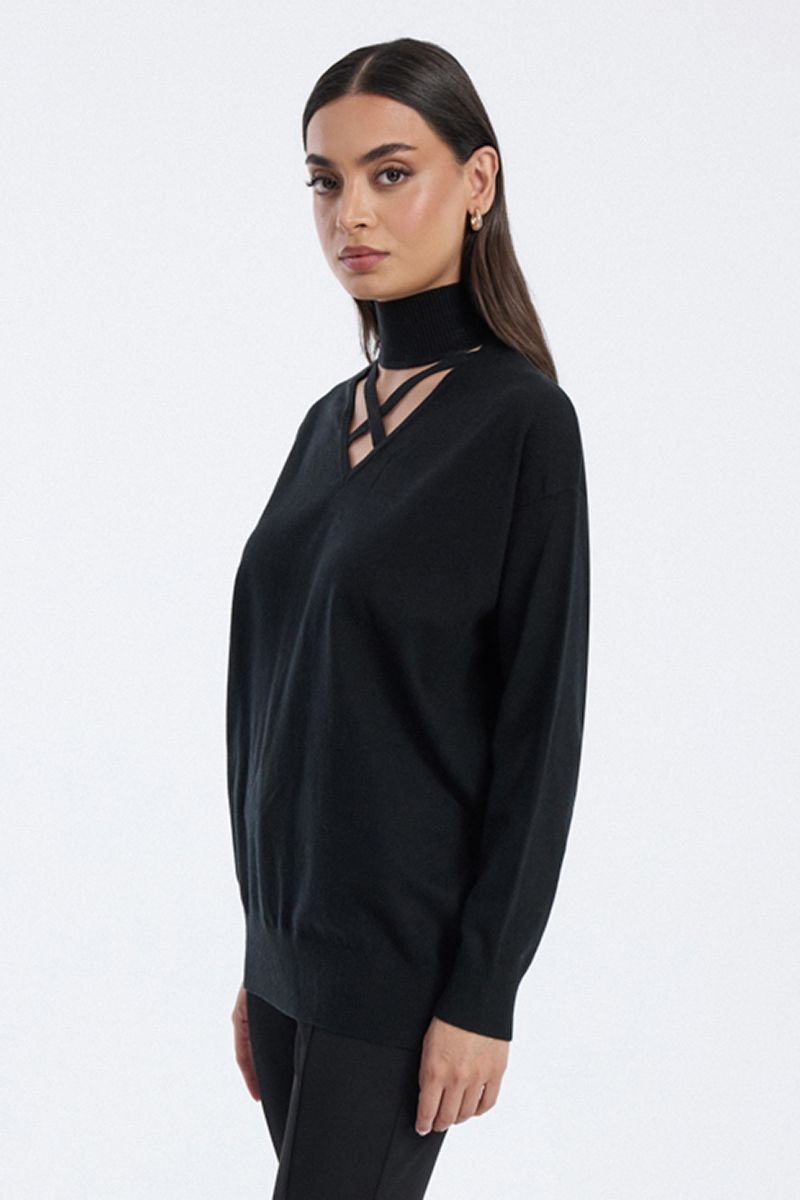 Stylish knitted sweater designed with a modern choker neckline and front cross strap detail Features a relaxed silhouette with long sleeves for everyday comfort A versatile piece that combines minimal elegance with a trendy touch