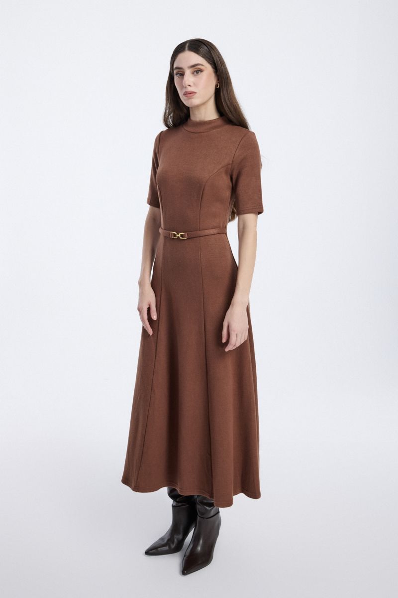 A sophisticated long dress featuring short sleeves and a high neckline finished with a slim waist belt that enhances the silhouette. Designed with a clean and elegant cut making it suitable for both casual and refined looks.
