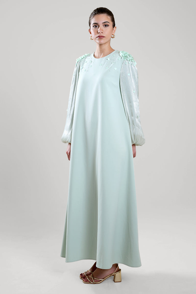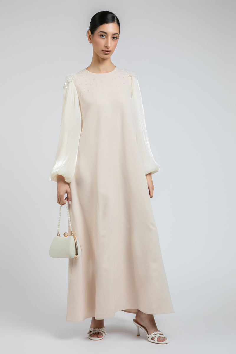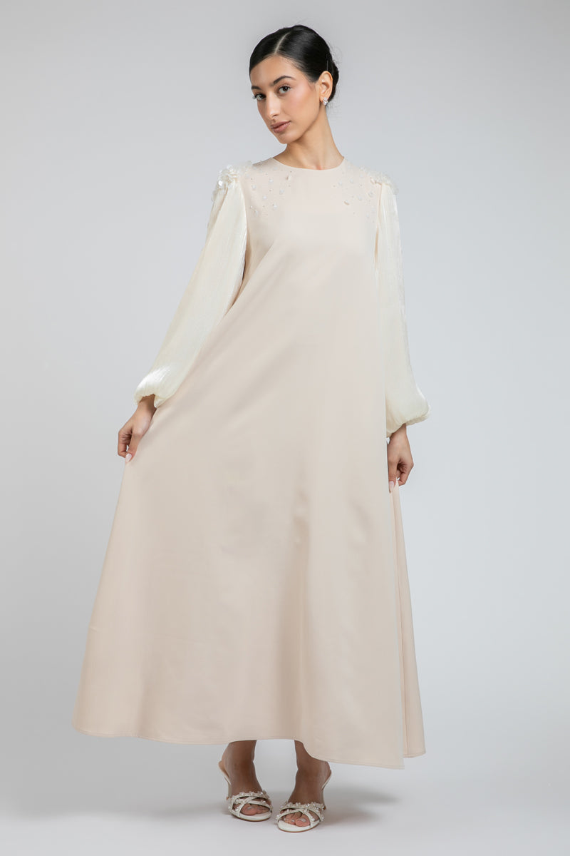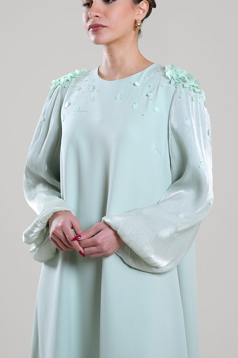 A flowing maxi dress designed with a relaxed silhouette for effortless elegance. Features a clean round neckline and sheer long sleeves with soft volume at the cuffs. Subtle embellishments at the shoulders add refined detail without overpowering the design. The fluid cut offers comfort and graceful movement, making it suitable for formal occasions, evening gatherings, and elevated daytime wear.