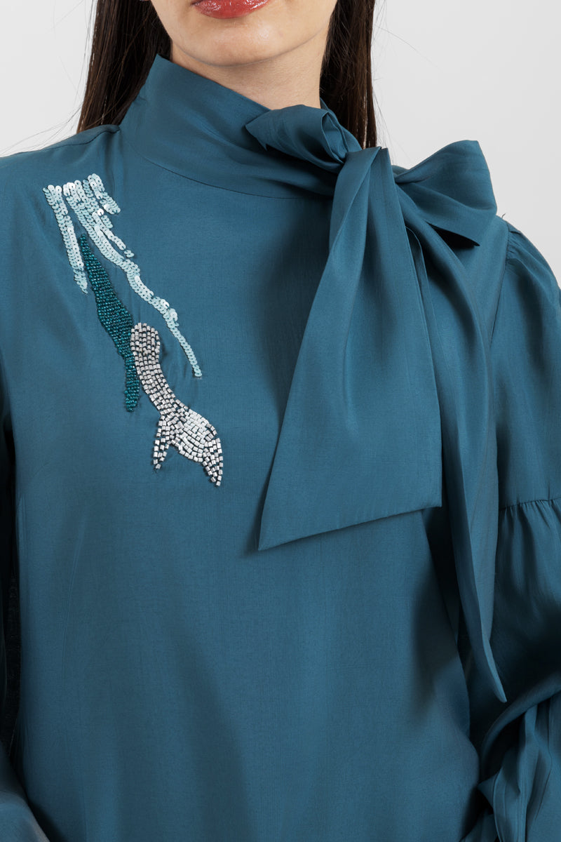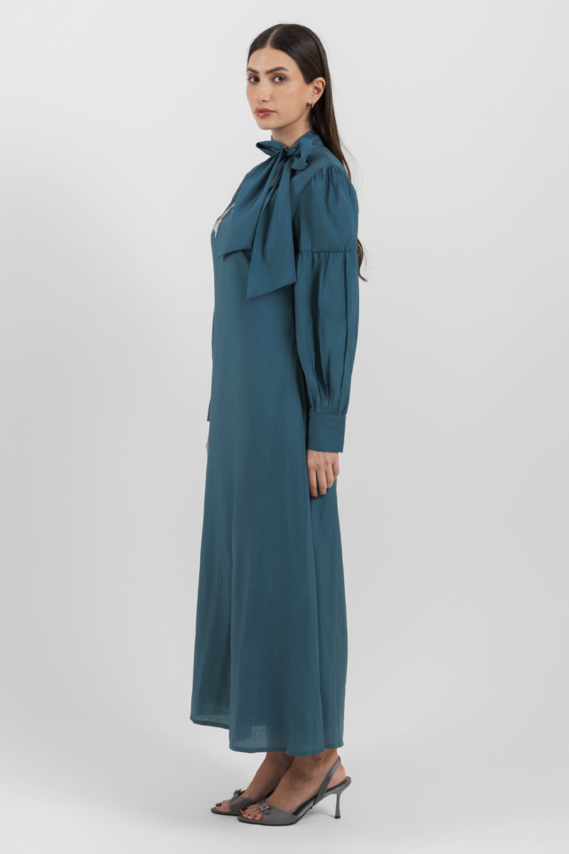 maxi dress designed with a flowing silhouette and relaxed fit. Features a high neckline with a side tie detail and subtle decorative accent, paired with long sleeves for a refined everyday look