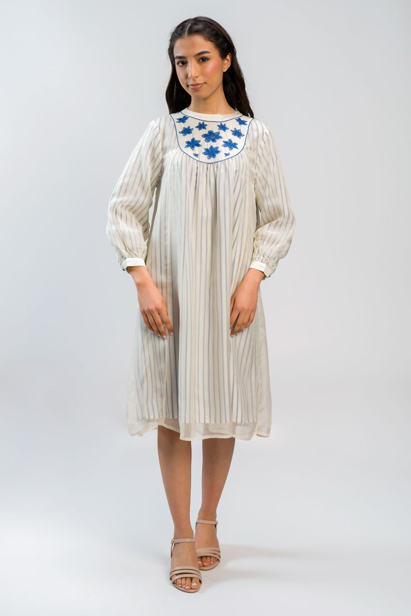 A comfortable midi dress with a relaxed, flowing silhouette. Features delicate front embroidery and long lightweight sleeves with refined cuff details. Easy to wear and suitable for everyday styling or casual occasions.
