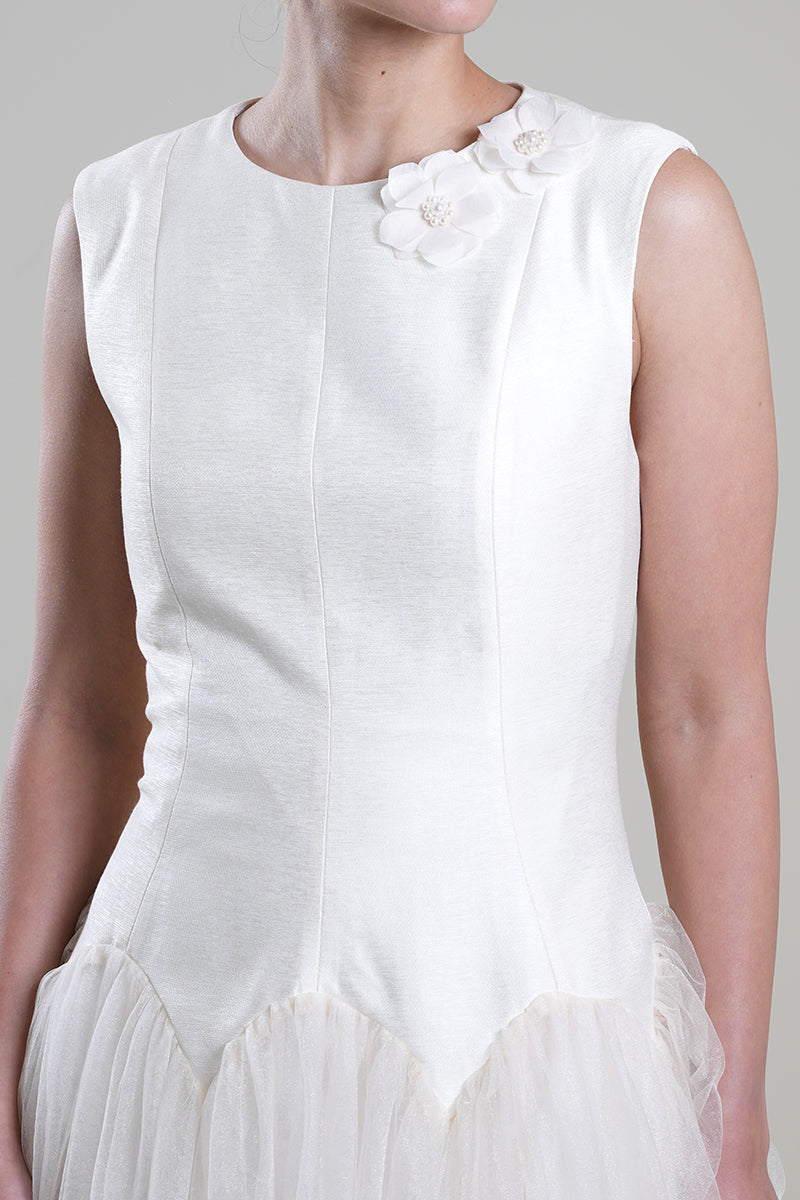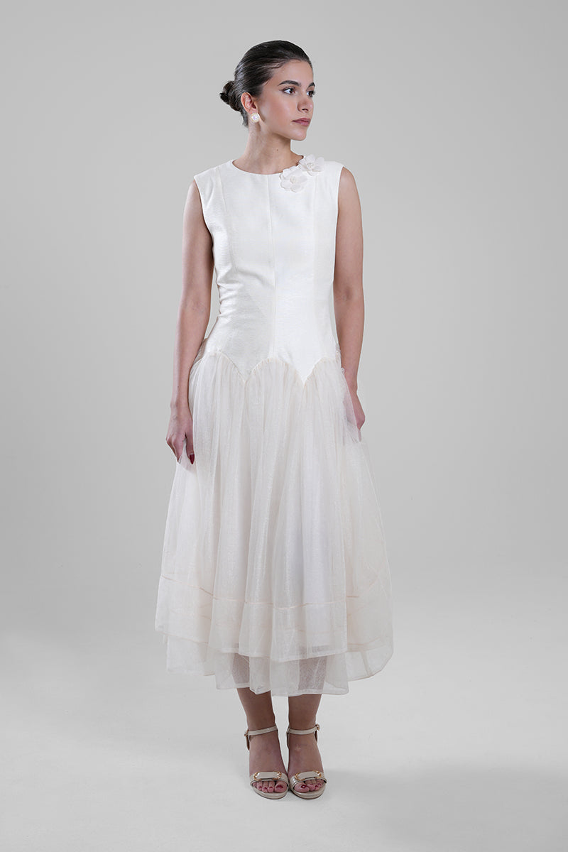 A sleeveless midi dress featuring a clean, structured bodice and a softly layered tulle skirt for an airy, flowing silhouette. Finished with subtle shoulder detailing that adds refined elegance. Ideal for understated occasions and polished day-to-evening looks.