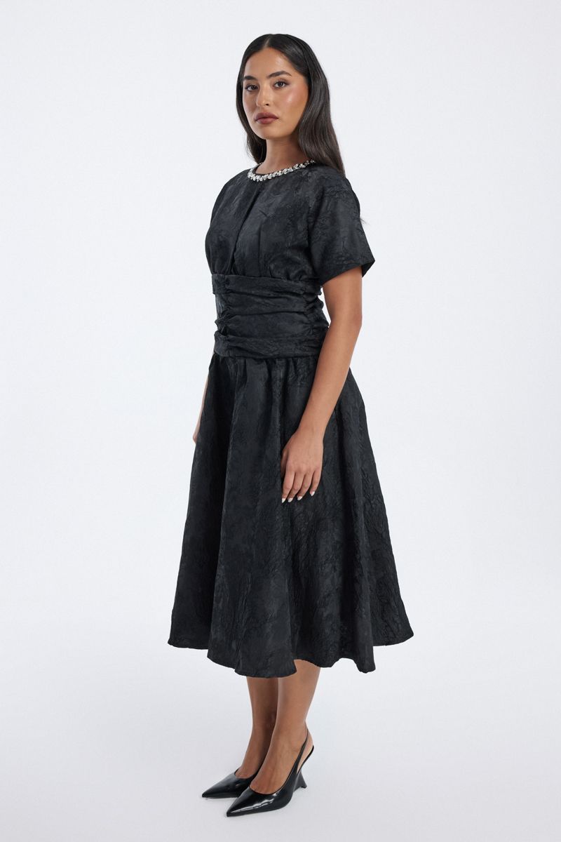 Sophisticated midi dress designed with a textured jacquard fabric Featuring a round embellished neckline short sleeves and a ruched waist detail that enhances the silhouette Perfect for formal occasions and evening styling
