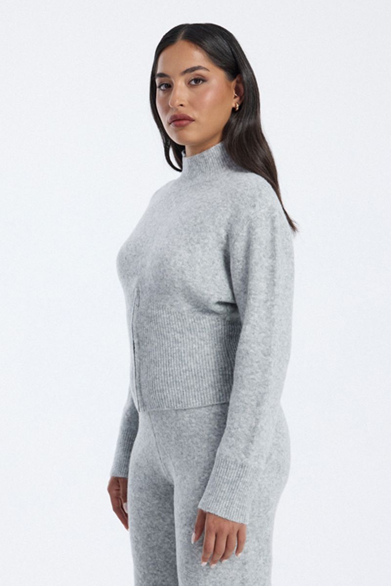 Soft knit sweater designed with a mock neckline Features a fitted ribbed waist with central zip detail Long sleeves and dropped shoulders offer relaxed comfort Blends modern structure with cozy wearability