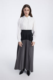 A chic maxi dress featuring a pleated skirt design with a comfortable elastic waistband. The two-tone style adds a modern touch, while the flowy silhouette makes it perfect for both casual and elegant occasions.