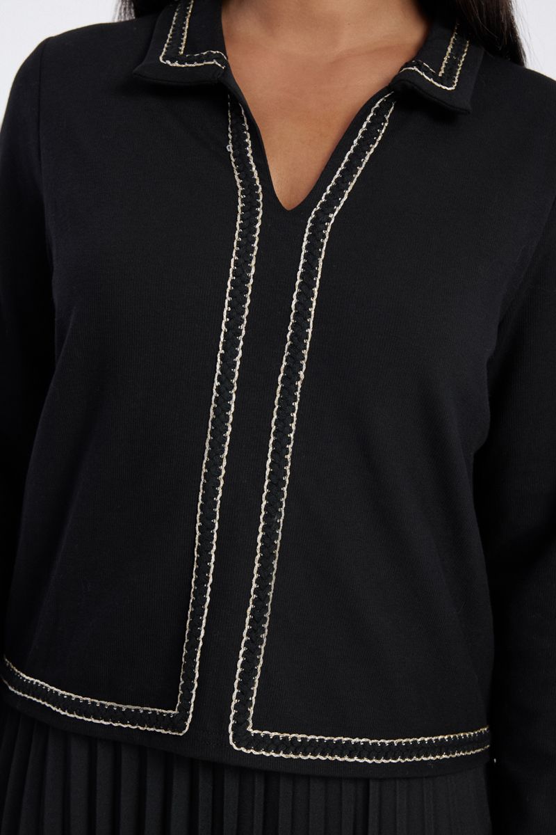 Elegant midi dress featuring a pleated skirt and contrast trim detail on the bodice Designed with long sleeves and a flattering silhouette for both workwear and social occasions
