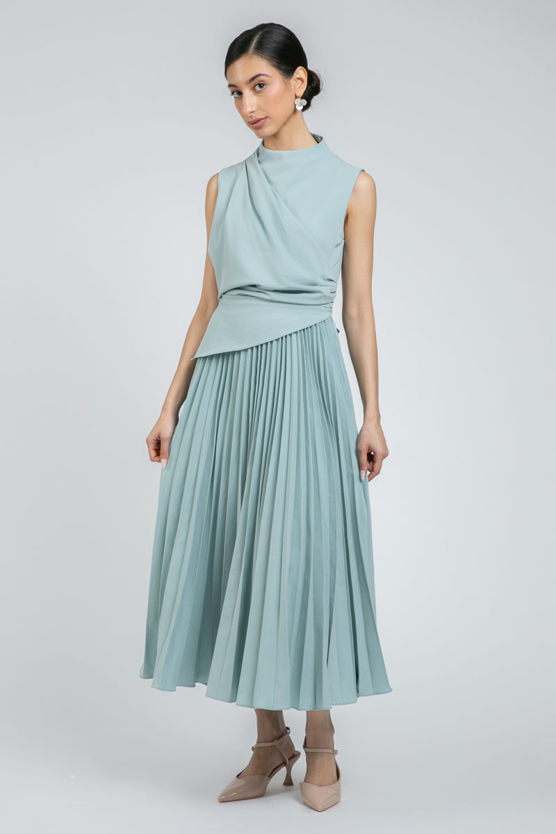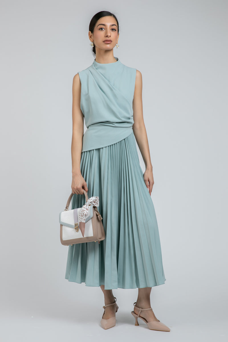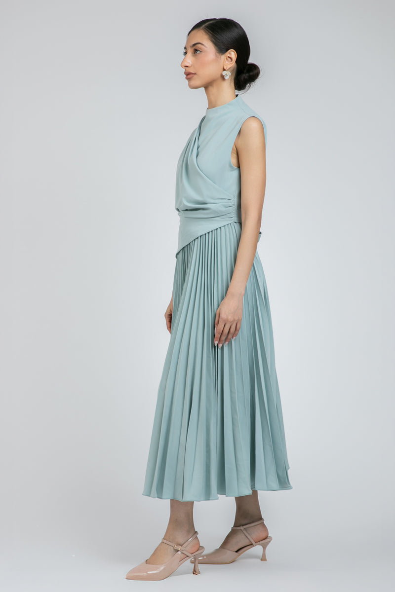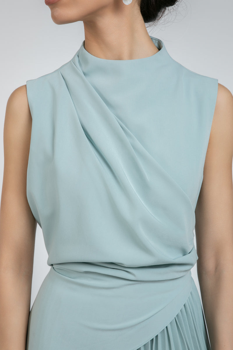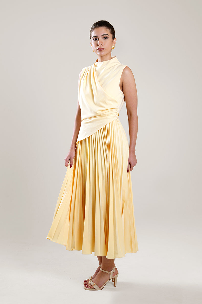 An elegant midi dress designed with a sleeveless silhouette and a softly draped wrap-style bodice. The pleated skirt adds fluid movement, while the defined waist and back tie detail create a flattering, adjustable fit. Ideal for refined daywear, formal gatherings, or elevated evening looks.