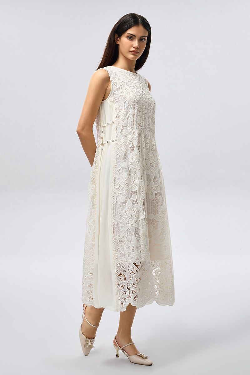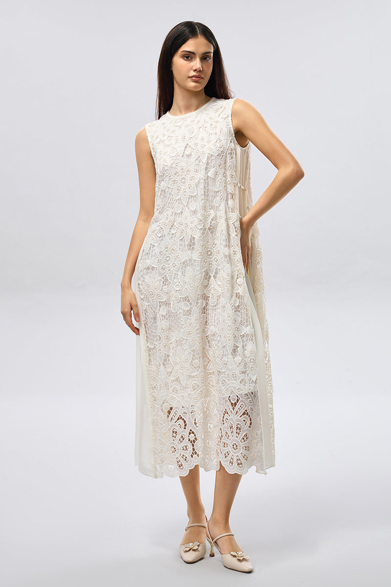 An elegant midi dress designed with a sleeveless silhouette and intricate lace detailing throughout. The lightweight lace overlay creates a refined texture, while the relaxed fit offers graceful movement and comfort. A versatile piece suited for daytime occasions, formal gatherings, or understated evening styling.