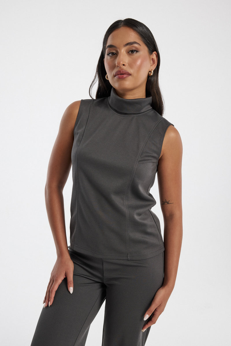 Elegant sleeveless blouse designed with a structured mock neck and a subtle back keyhole closure. Tailored for a refined silhouette, ideal for layering or wearing alone for a polished look.