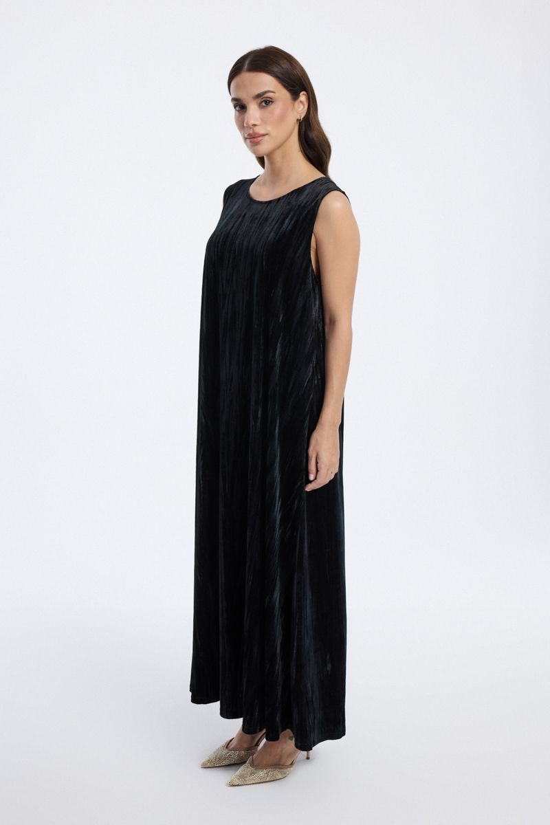A sleeveless velvet maxi dress with a relaxed silhouette and elegant flow, offering timeless sophistication for evening wear or layered styling.