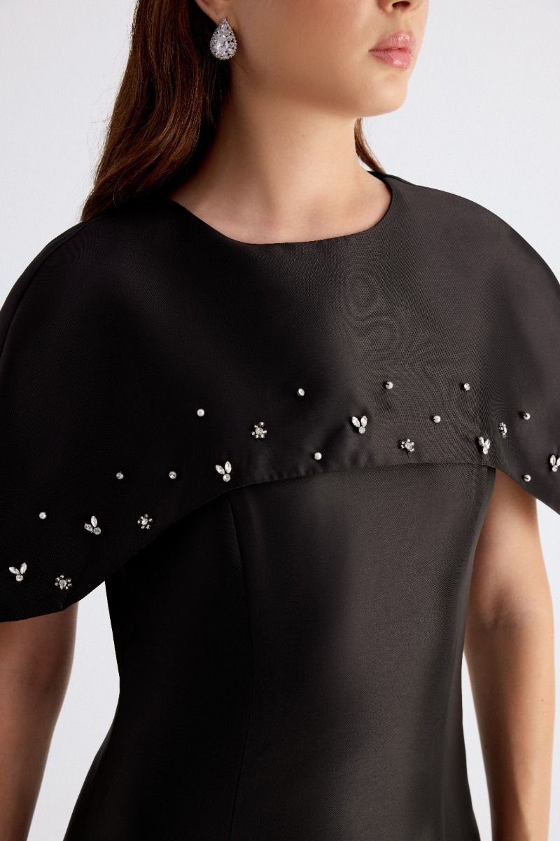 Turn heads with this stunning short sleeve longline evening dress, crafted from soft and delicate satin fabric. Designed with a dramatic shoulder shawl layer, a flattering fitted top, flowy ruffled hem, and sparkling rhinestone embellishments. Finished with a round neckline and back button closure for a graceful, unforgettable look.