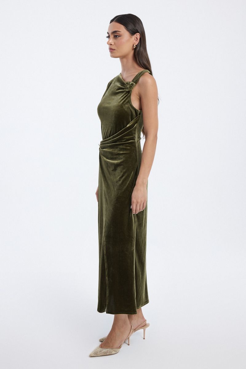 A sophisticated velvet maxi dress featuring an asymmetric neckline with one shoulder strap and soft draped detailing The design includes a gathered waist with a decorative embellishment and a wrap style front slit for an elegant refined look