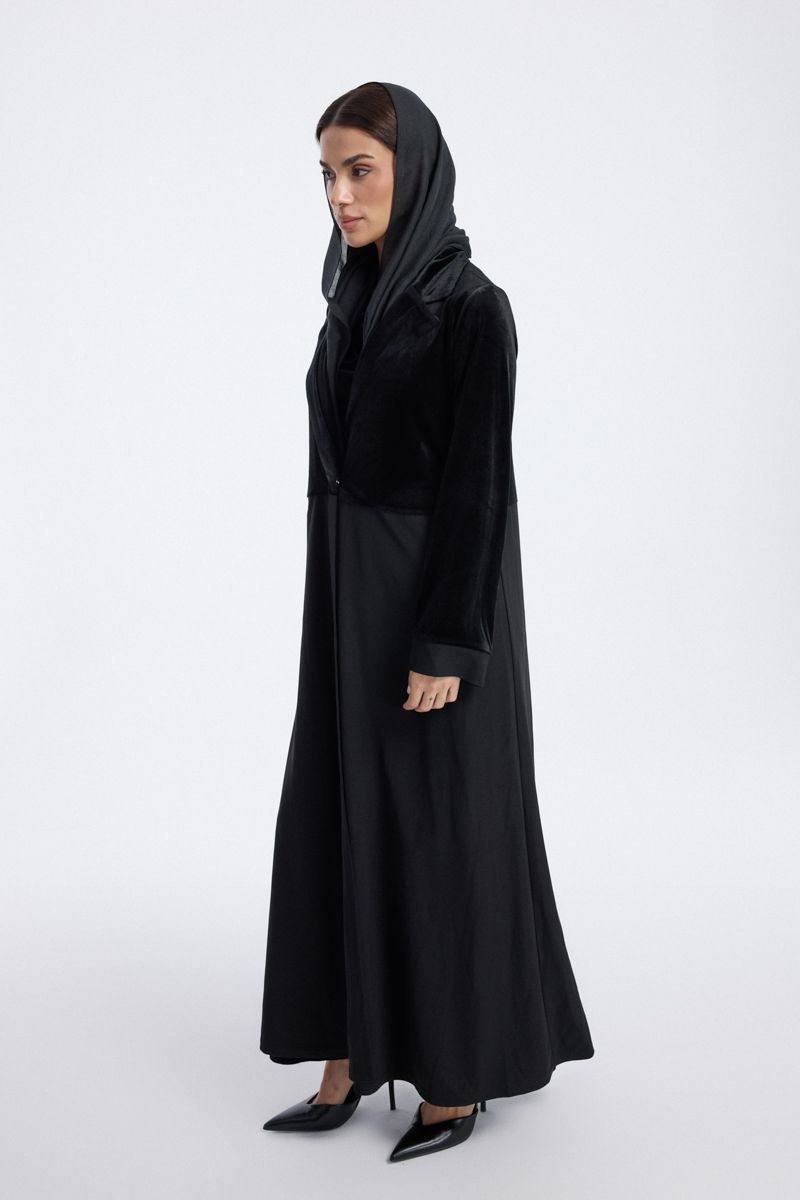 A longline abaya designed with a velvet panel at the top and a flowing fabric body. Features long sleeves and a tailored collar for a graceful and refined look.