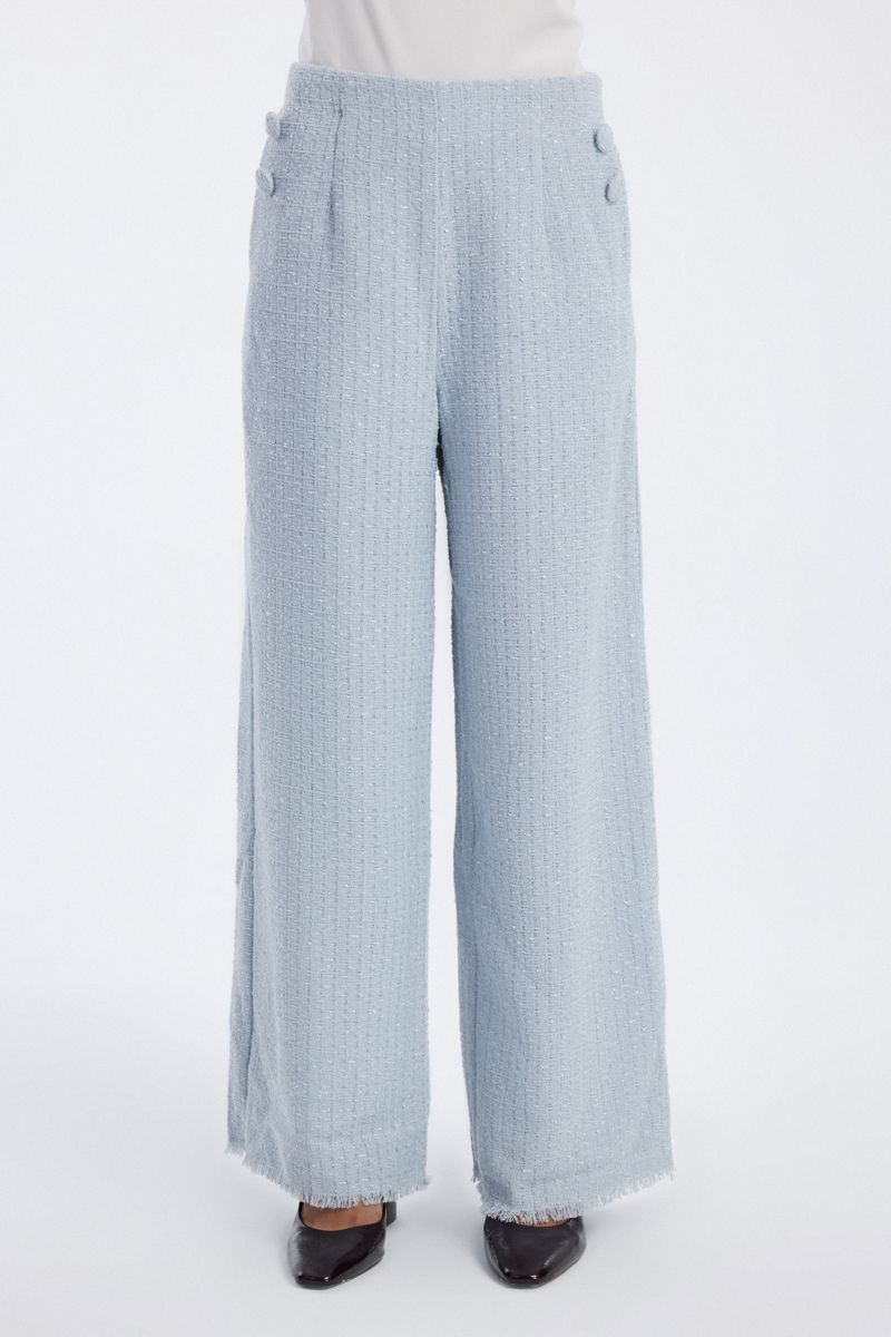 Chic wide leg trousers tailored from tweed fabric featuring side button accents at the waist and raw edge hems Designed for comfort and sophistication these trousers can be styled for both formal and casual occasions