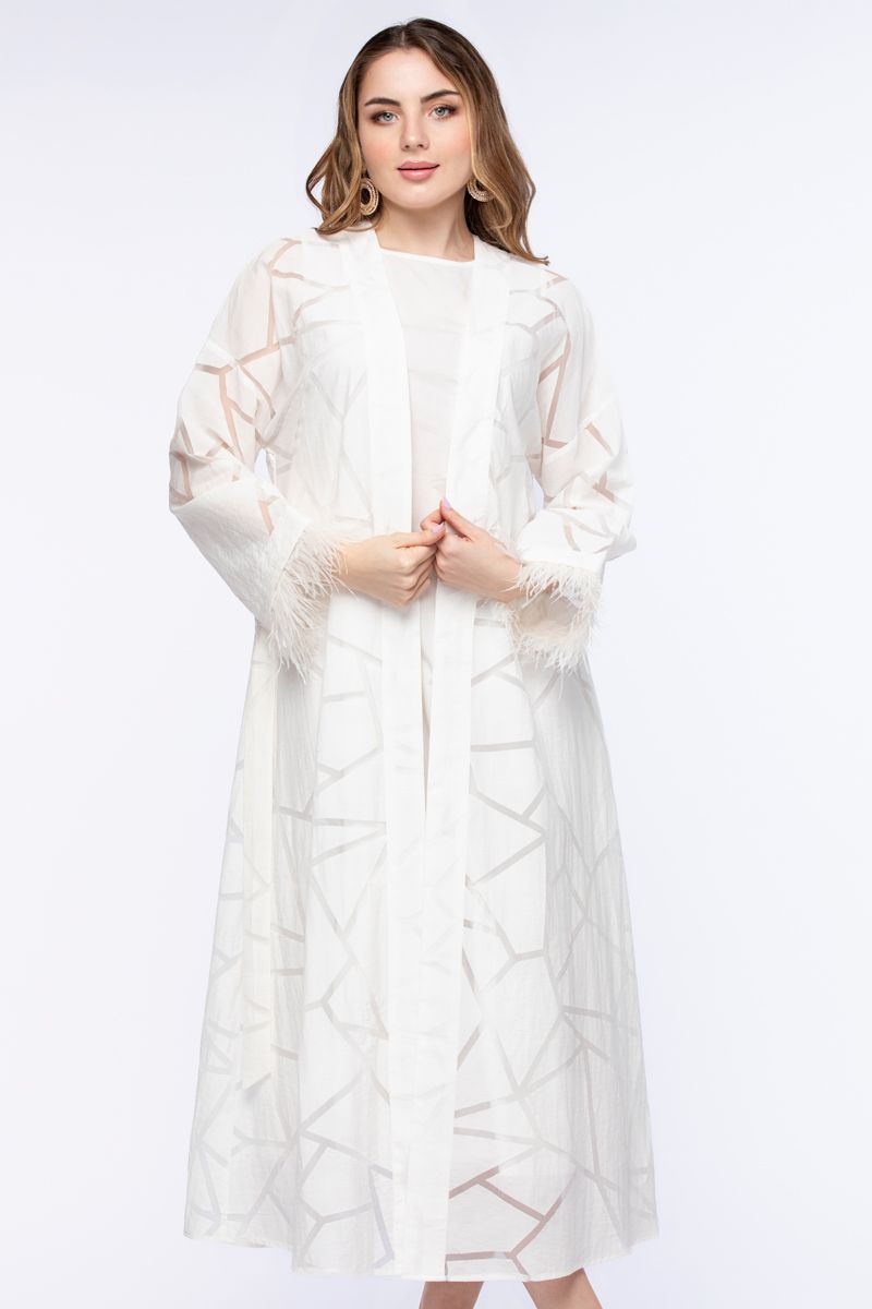 decorated with transparent lining details pattern pn full design and soft feather details on sleeves