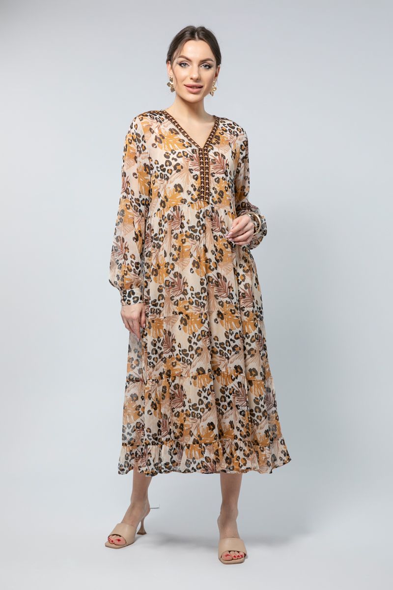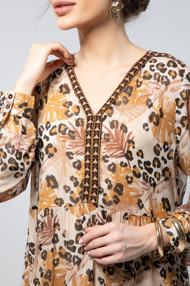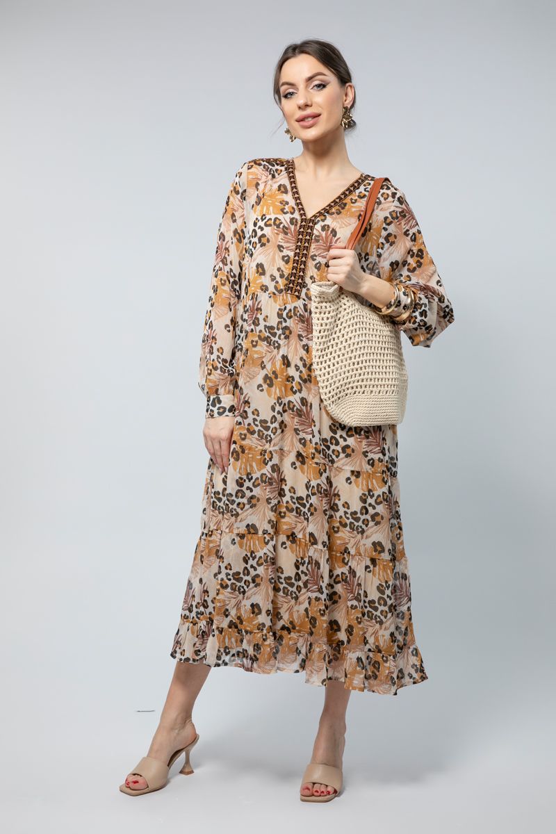 تألقي بإطلالة أنيقة وملفتة مع فستان طويل بأكمام طويلة وقصّة متدفقة، مصمم ليمنحكِ لمسة من الرقي في كل خطوة. يتميز الفستان بنقشة مطبوعة ناعمة تغطي التصميم بالكامل، مع تطريز بسيط وأنيق على فتحة الرقبة على شكل V، ليضفي لمسة أنثوية متقنة.