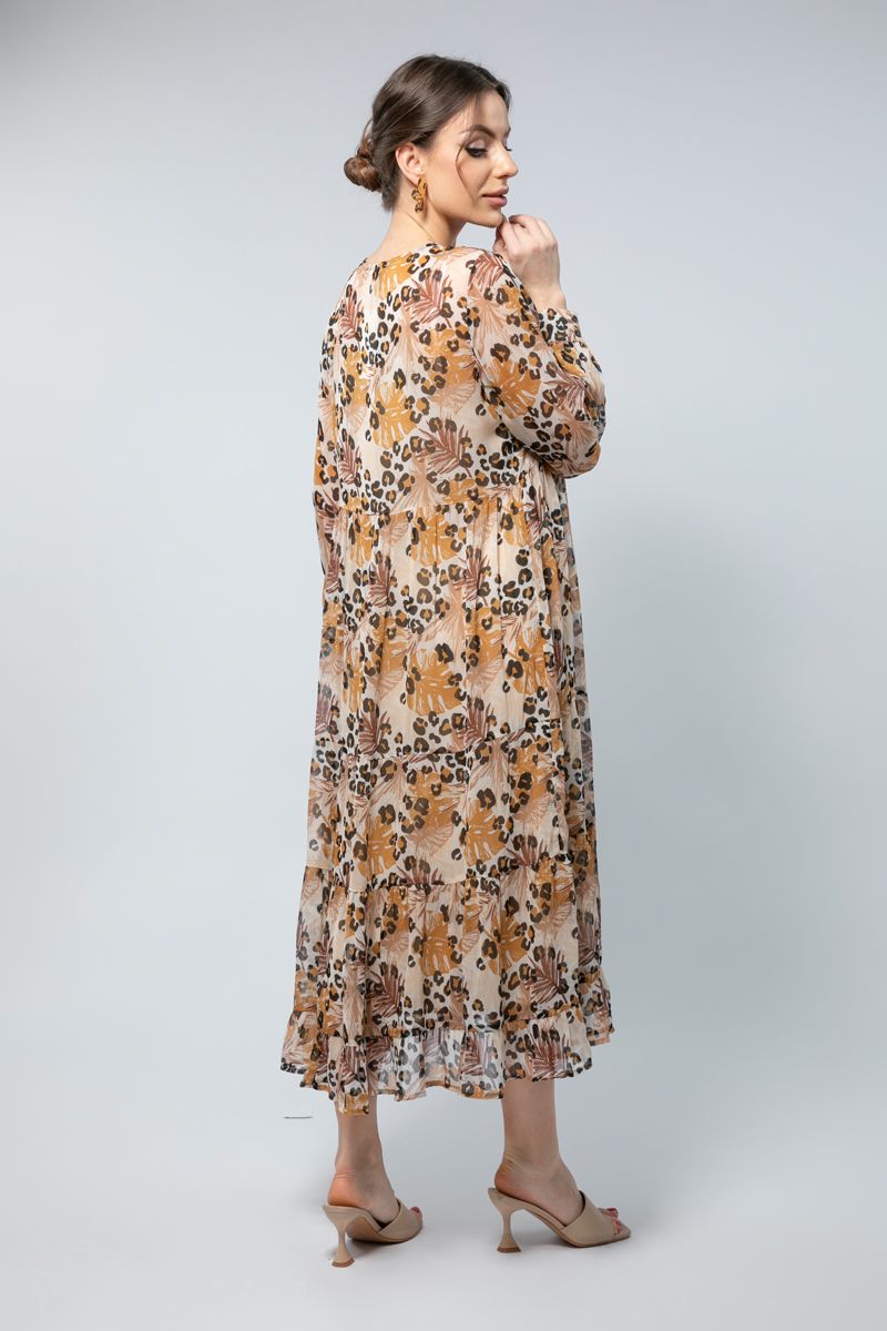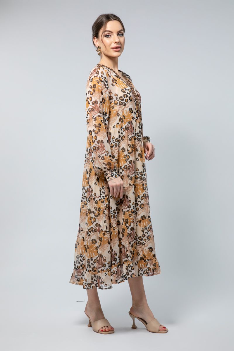 فستان طويل بأكمام طويلة وقصّة فضفاضة- طبعة ناعمة وتفاصيل راقية