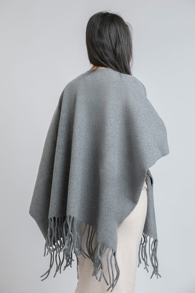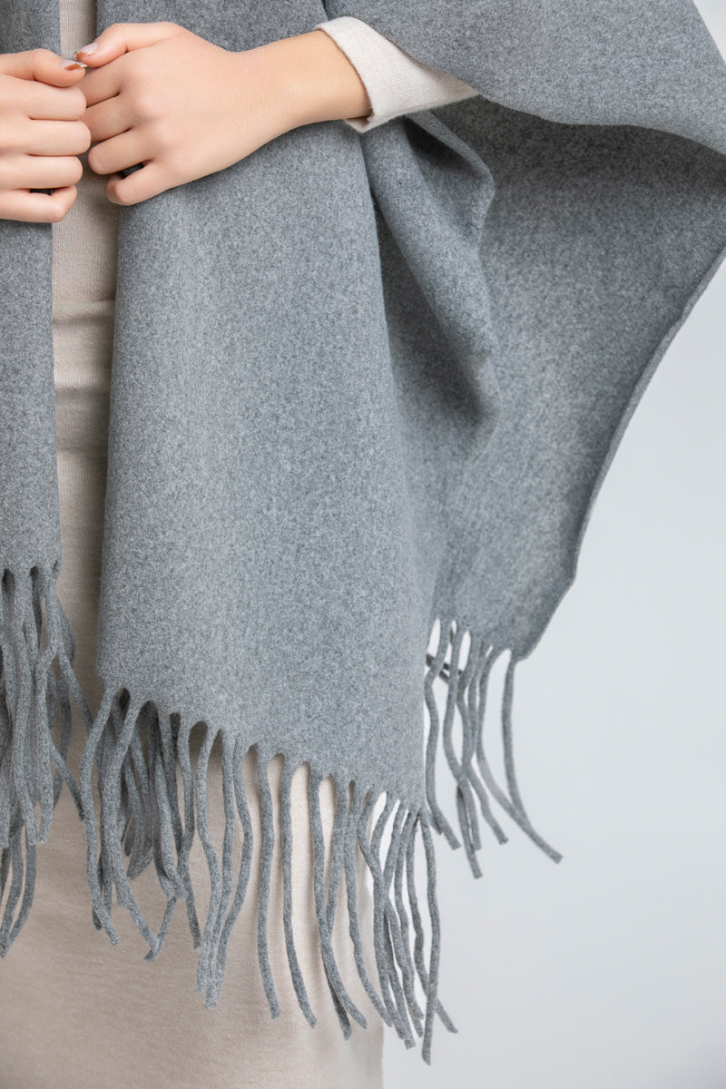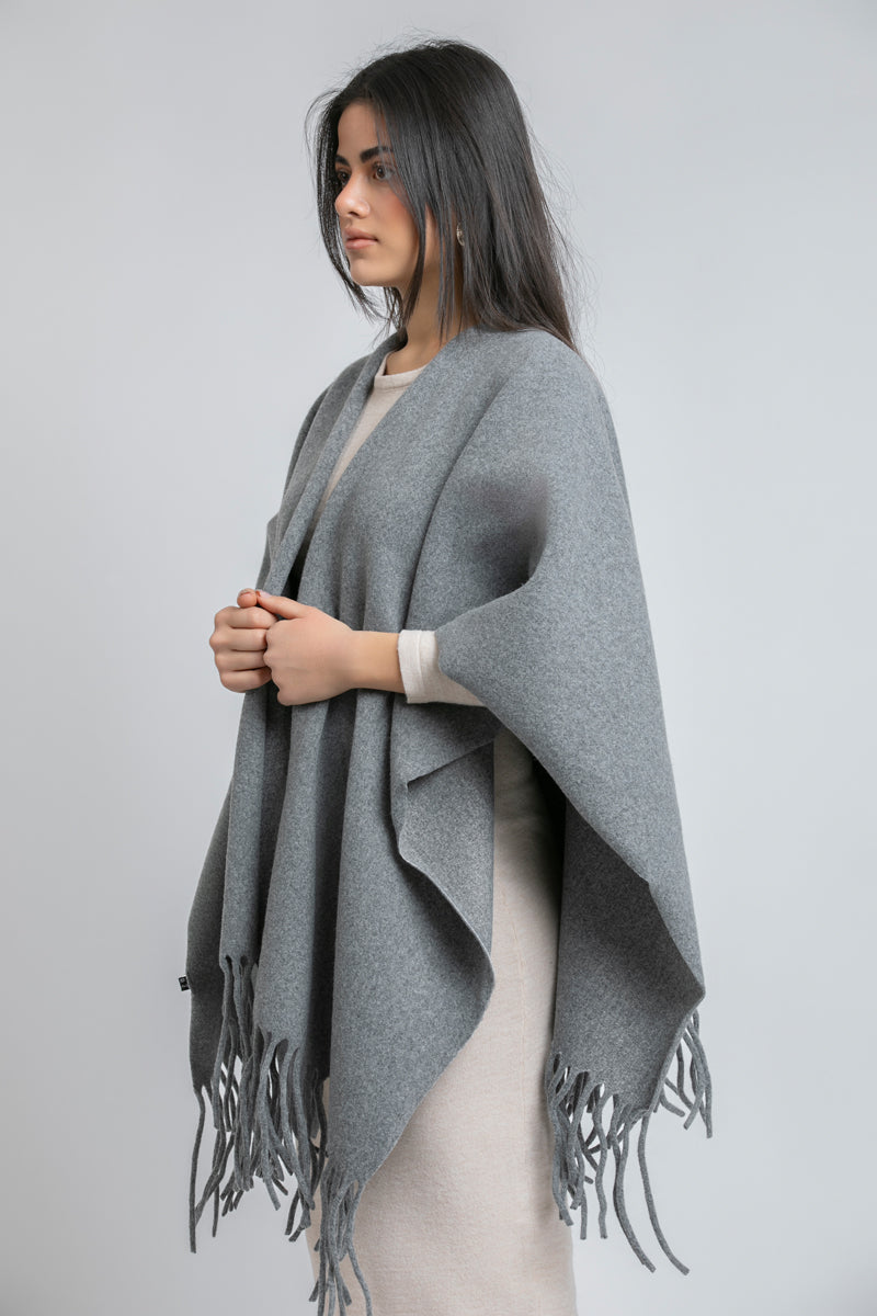 شال صوفي ناعم بتصميم واسع وانسيابي مع أطراف مزخرفة بشرابات أنيقة. مثالي لإضفاء لمسة دافئة وبسيطة على الإطلالة.