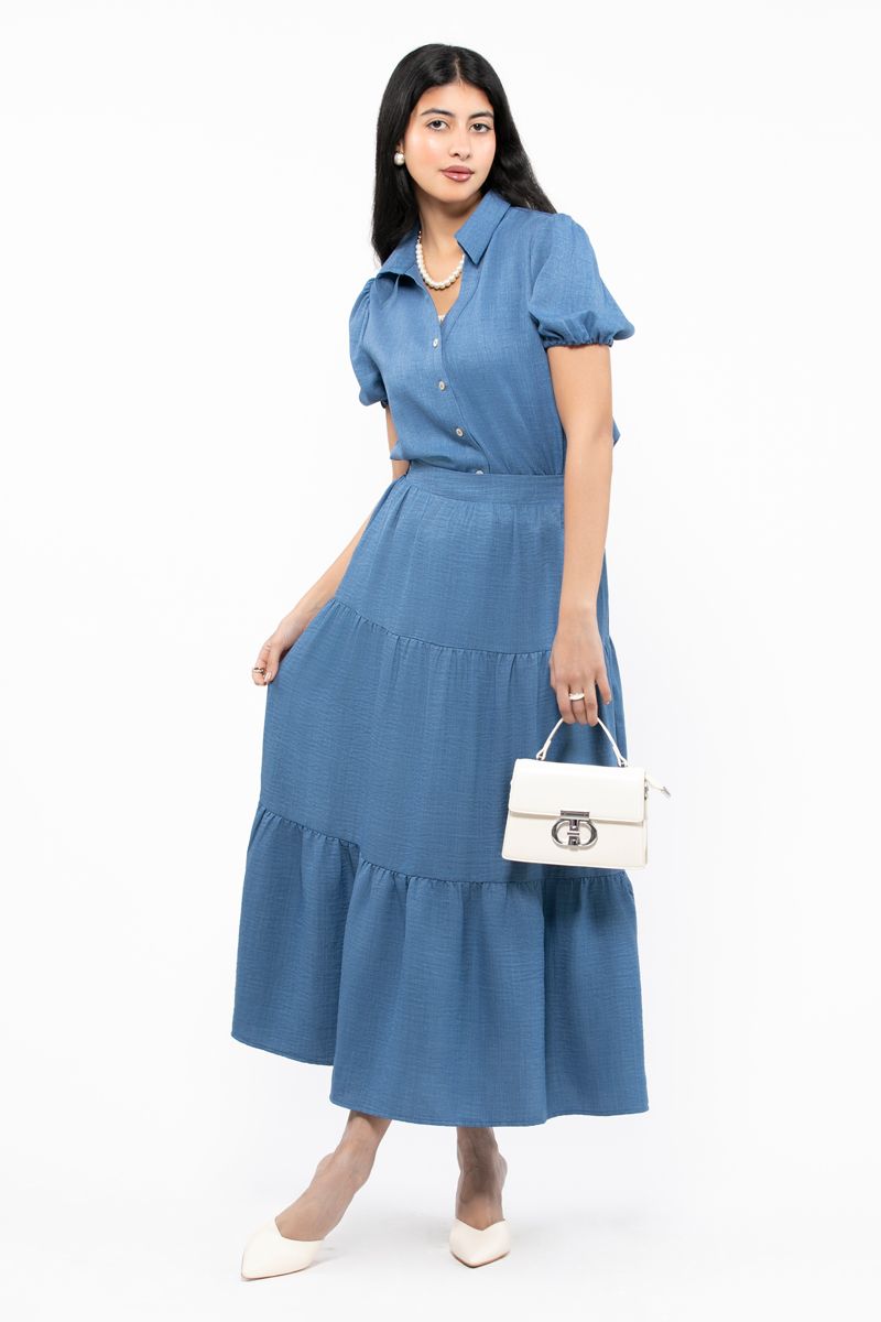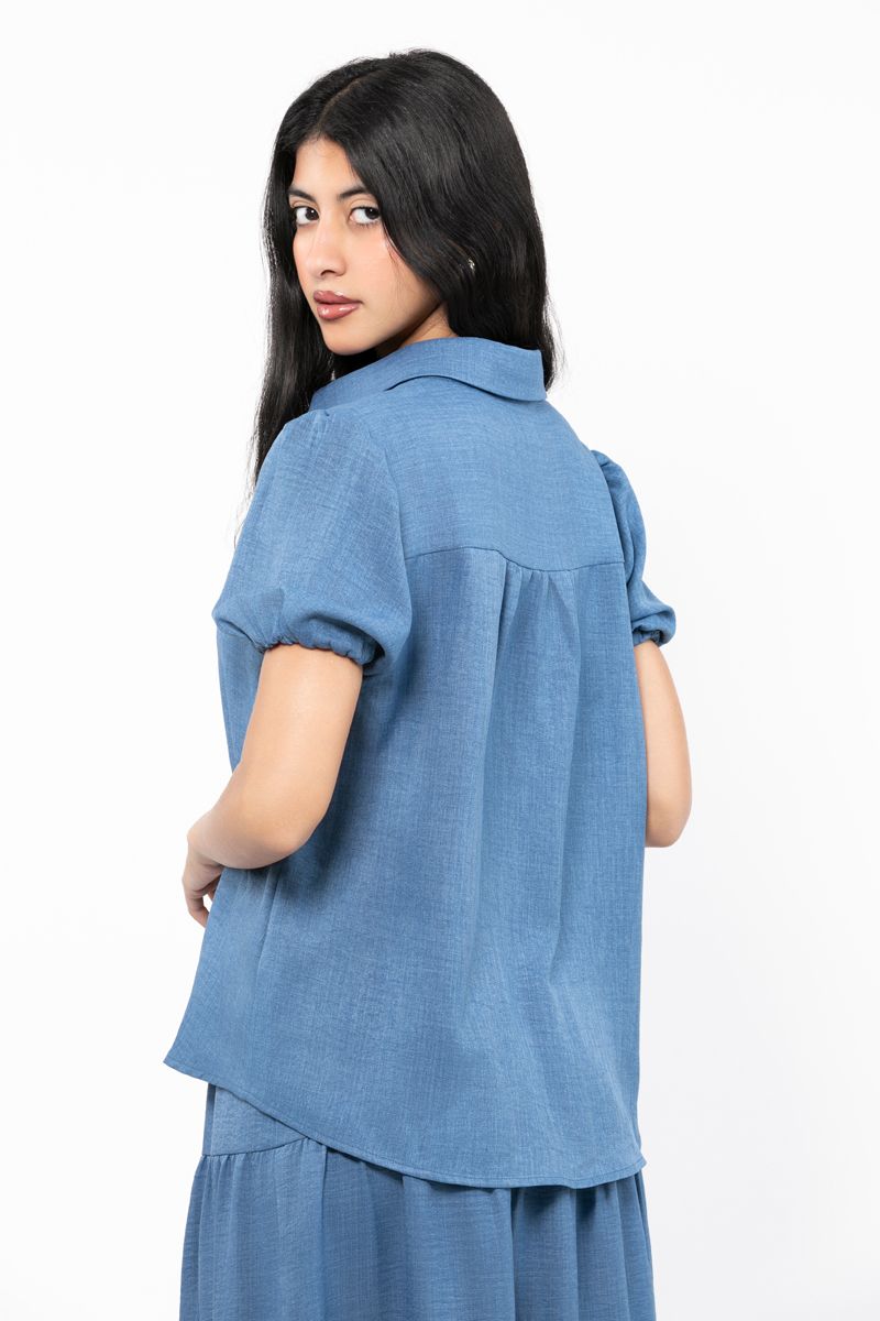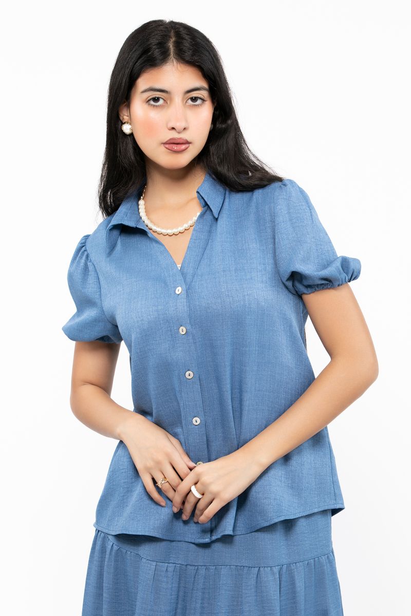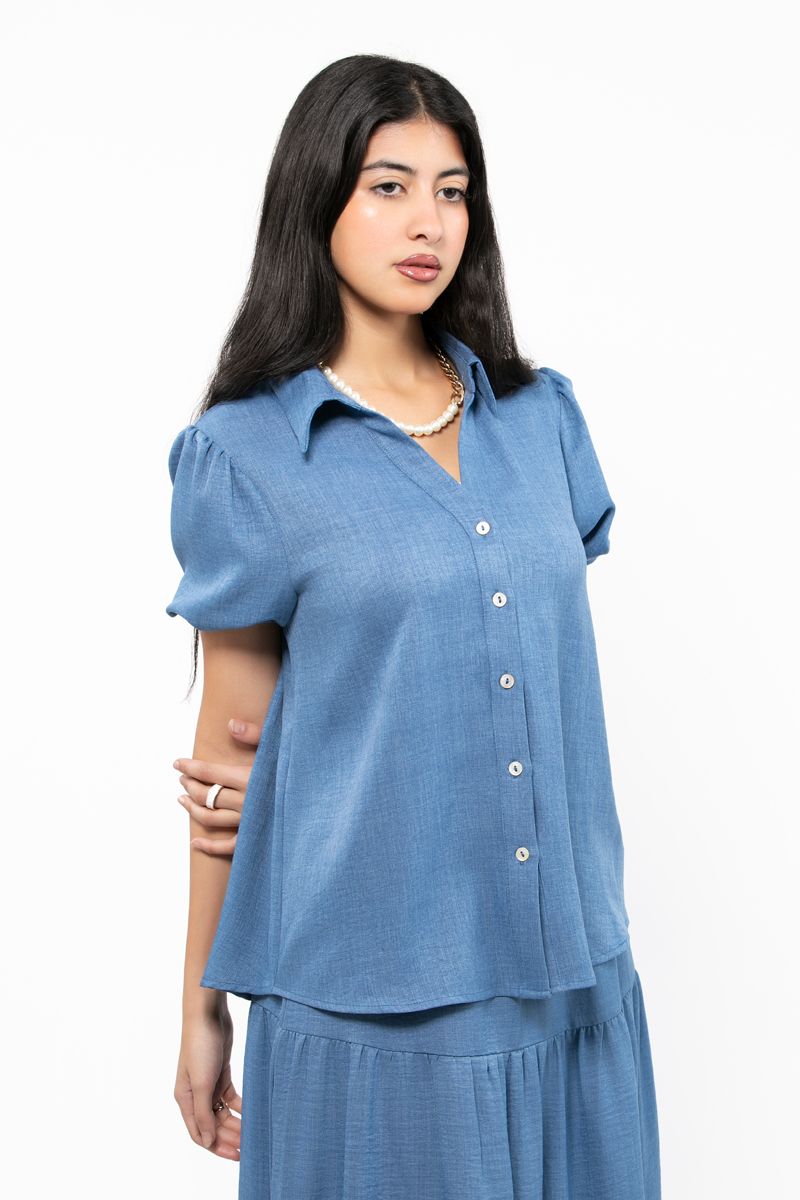 قميص جينز بناتي كاجوال بأكمام قصيرة وبنمط ذو لون موحد سادة، يأتي بأزرار للإغلاق من الجهة الأمامية، تفاصيل مطاطية على حاشية الأكمام وبياقة كلاسيكية مطوية