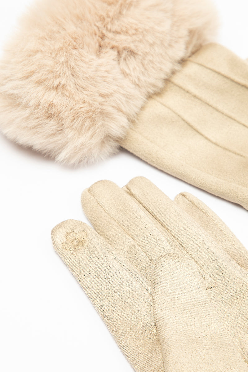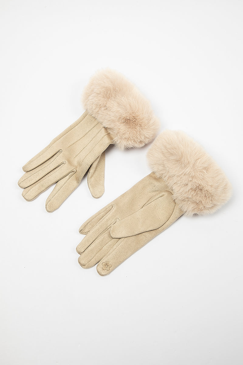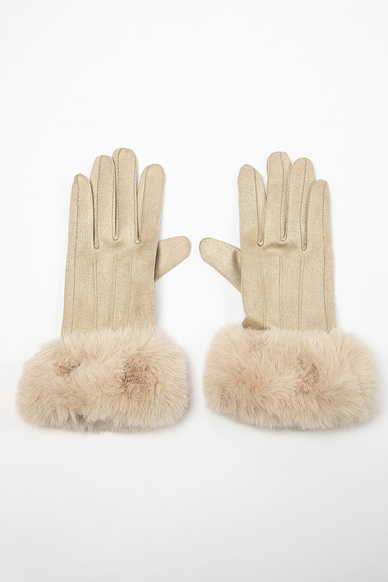 قفازات أنيقة مصنوعة من شامواه صناعي ناعم بتصميم كامل الأصابع مزودة بأطراف فرو ناعمة لإضفاء دفء ولمسة راقية إكسسوار مثالي لأيام البرد يكمل إطلالات الشتاء الأنيقة