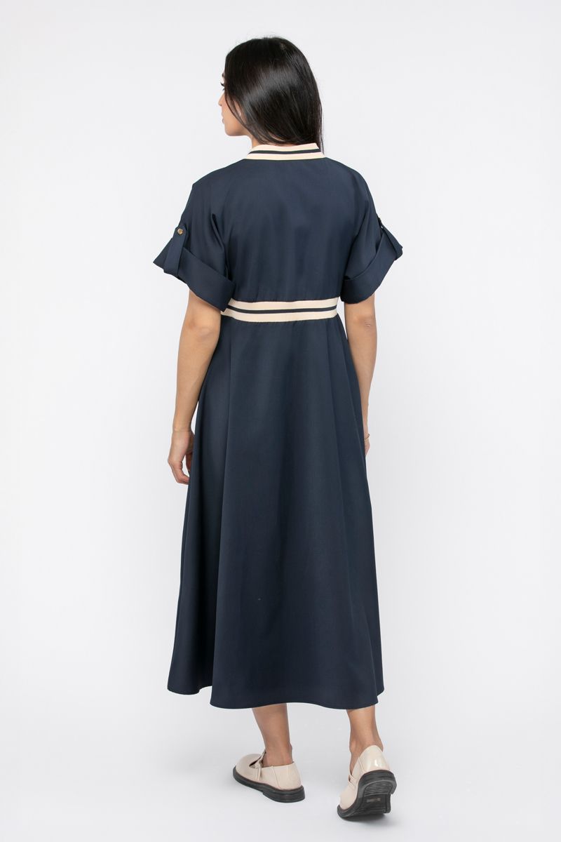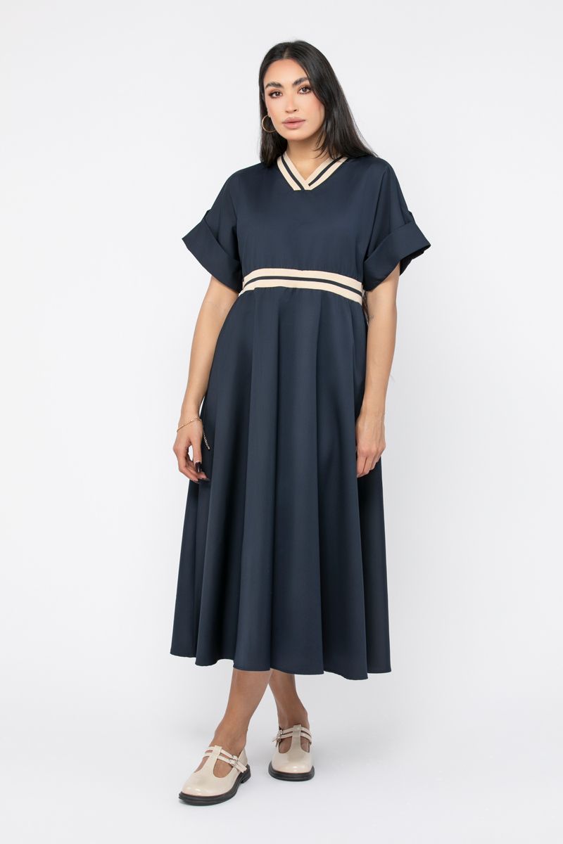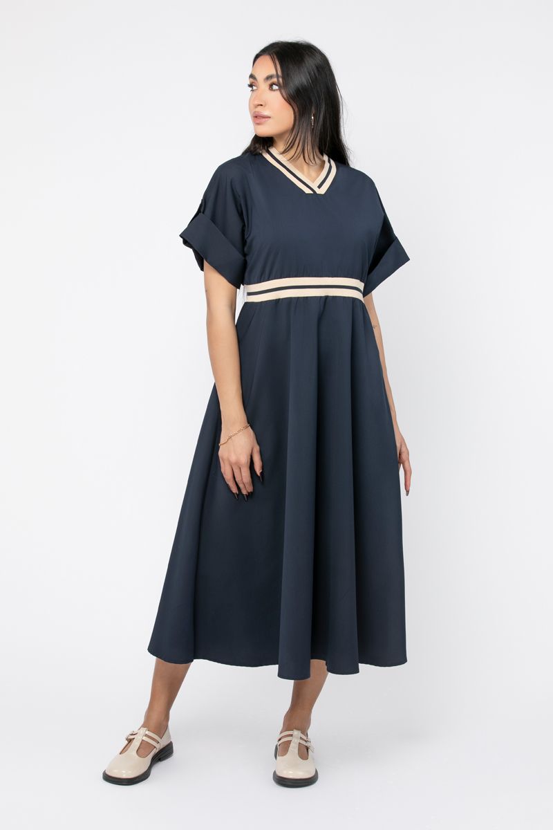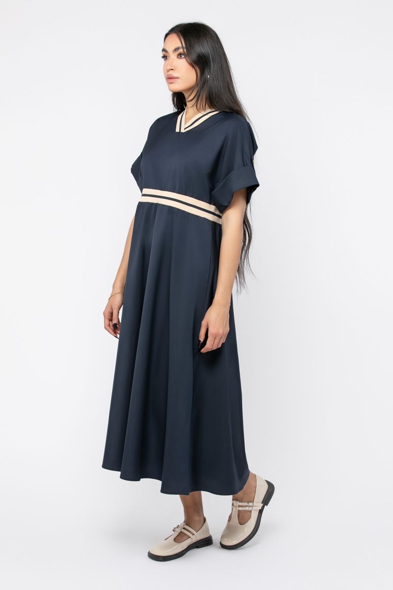 مزين بتفاصيل خطوط متباينة اللون على الخصر ومحيط الرقبة