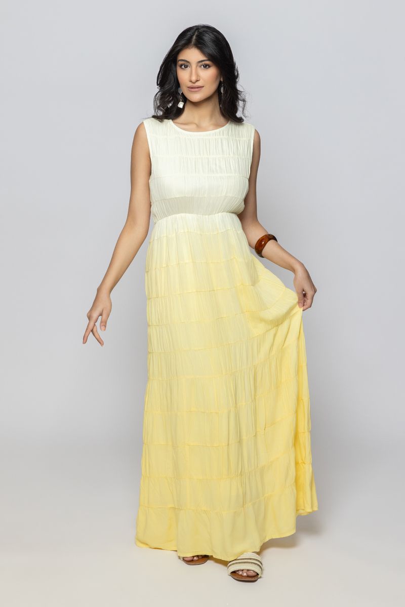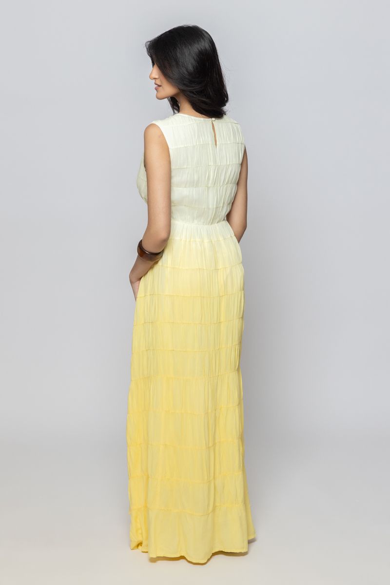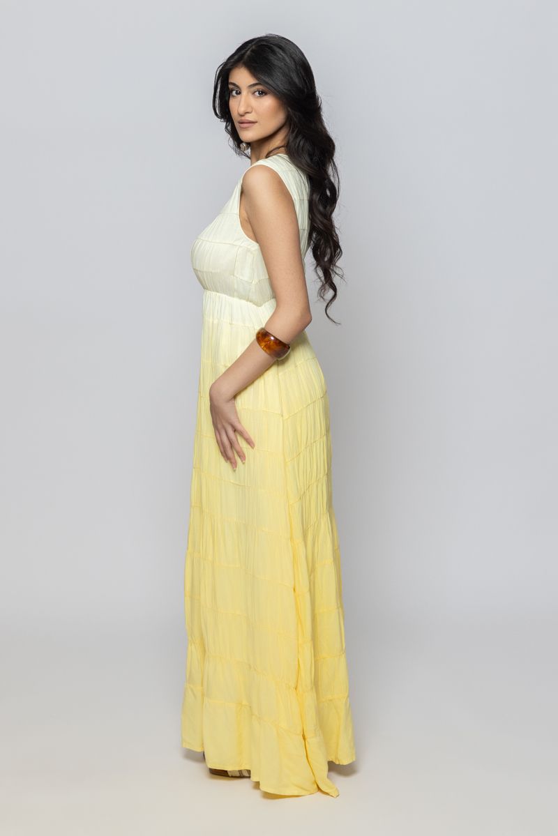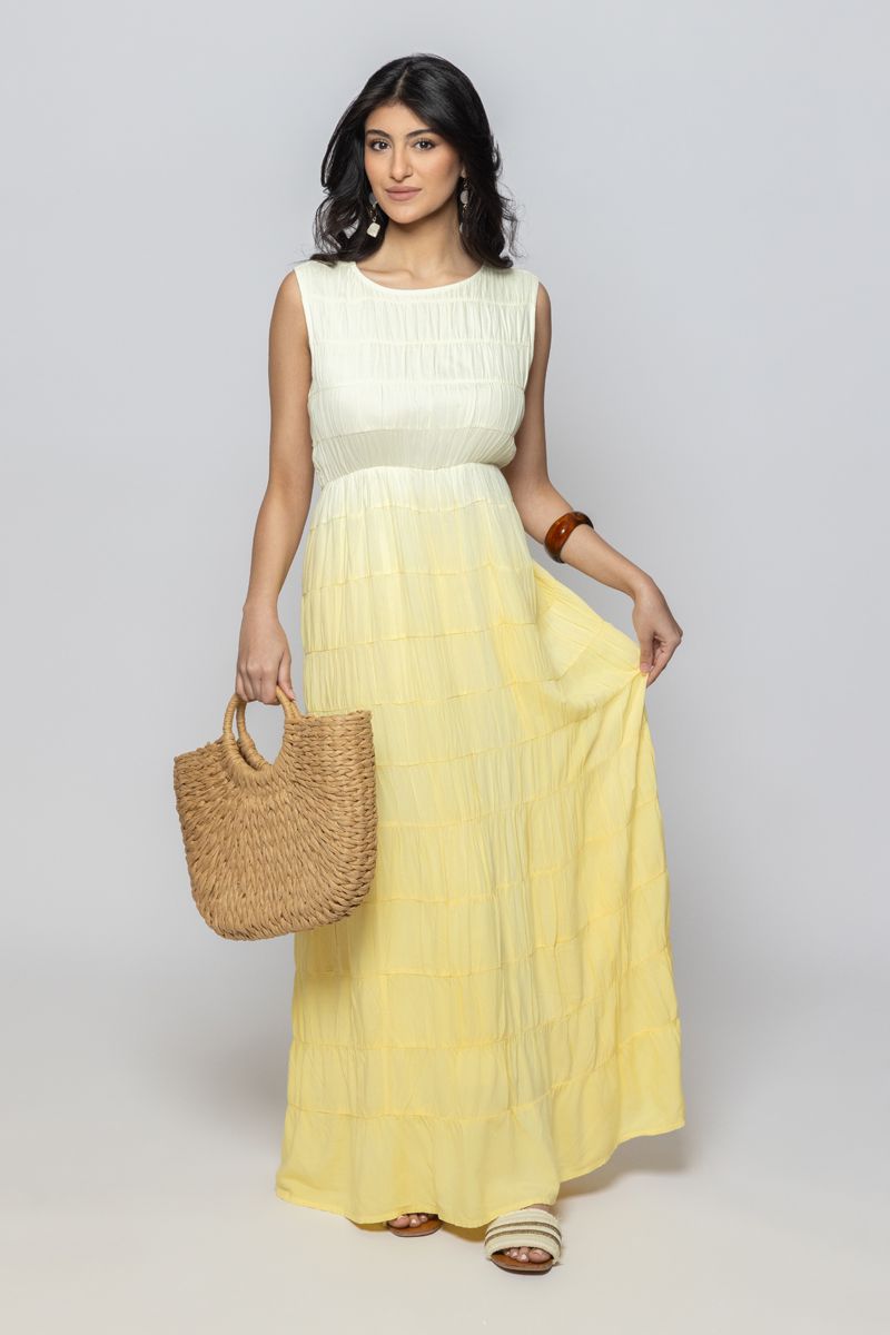 يجمع هذا الفستان الصيفي الطويل بدون أكمام بين نمط الألوان المتباينة والتفاصيل المتدرجة التي تضفي لمسة من الأناقة العصرية.