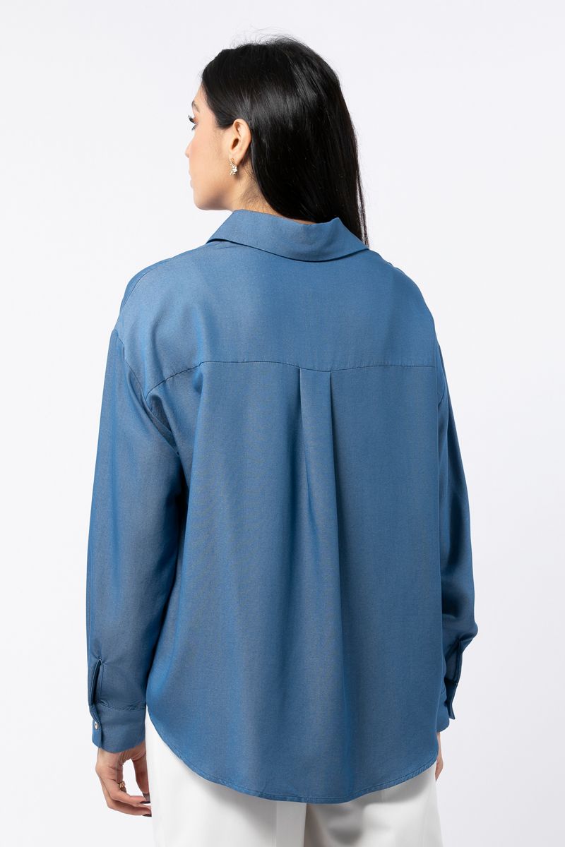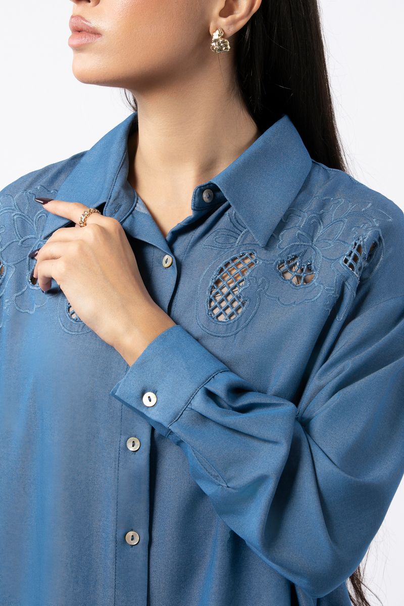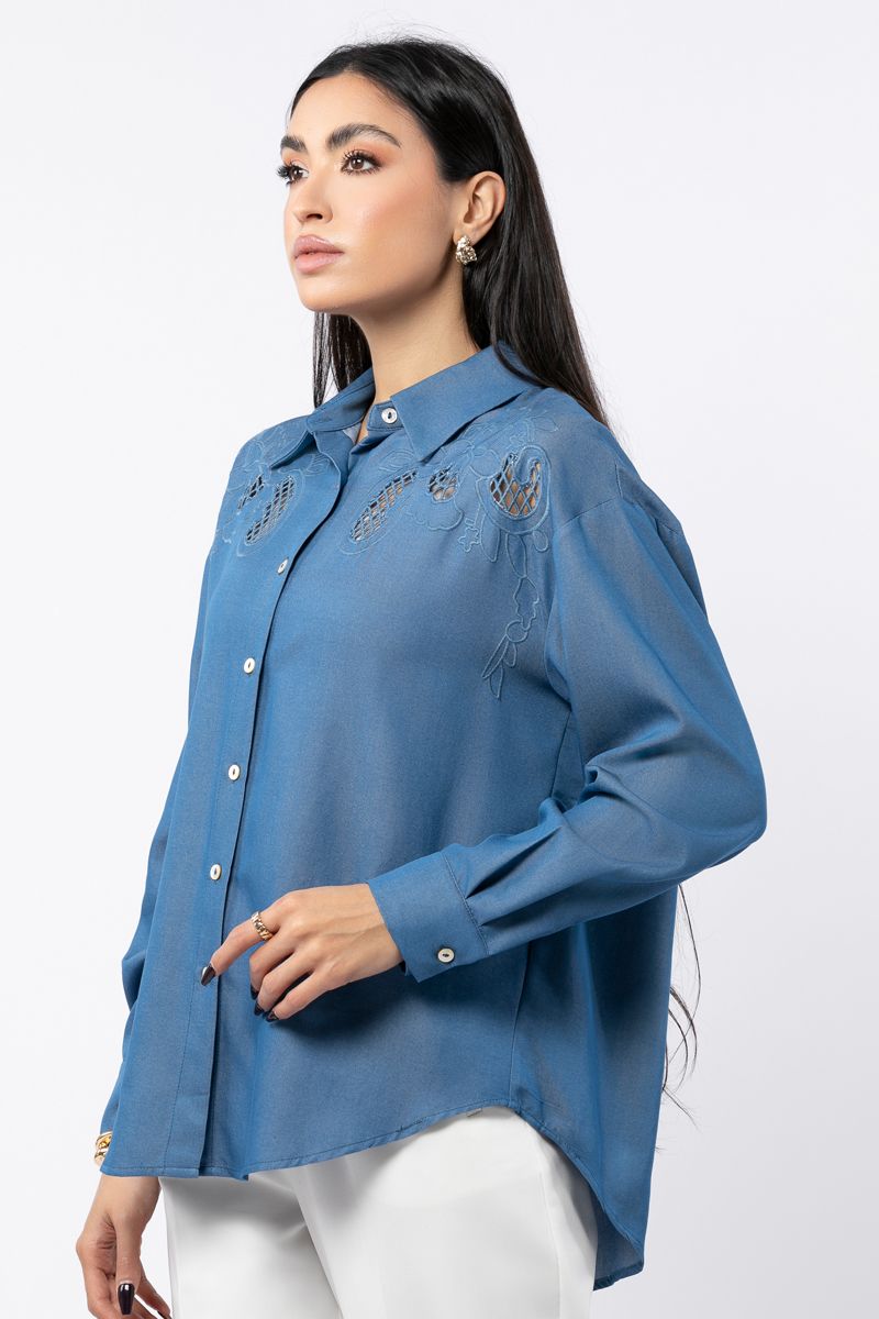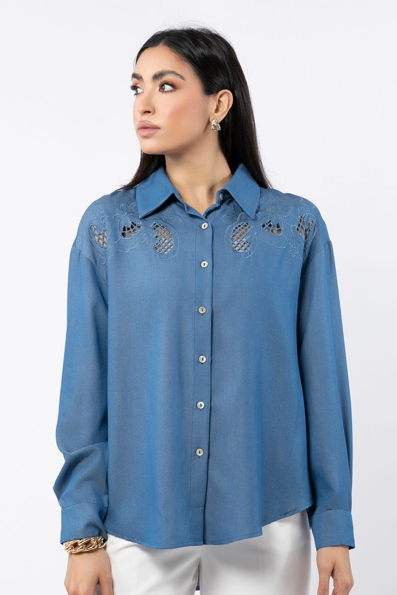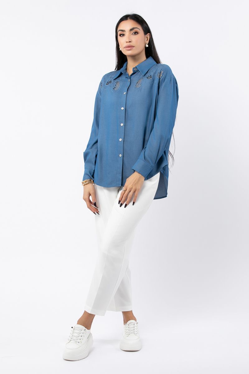 قميص جينز نسائي بفتحات مخرمة وتطريز