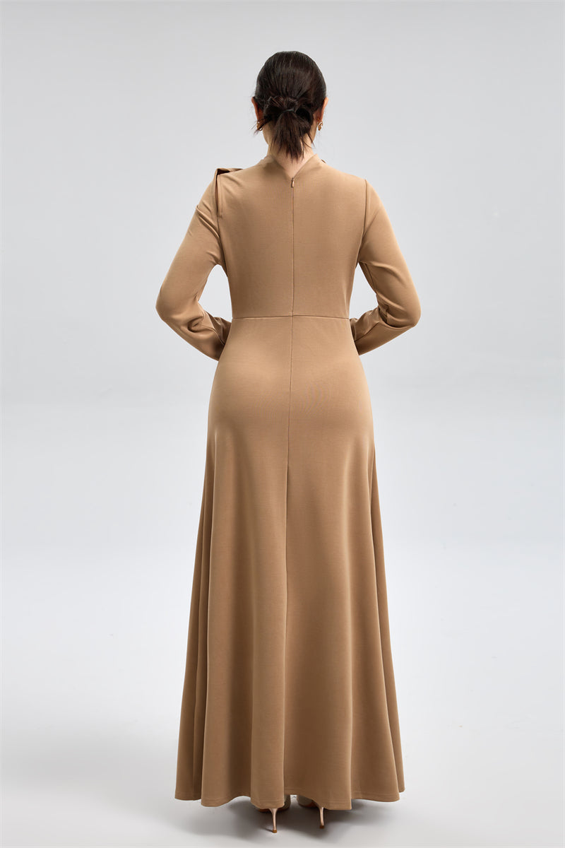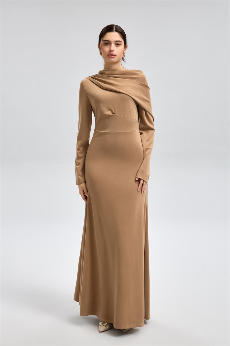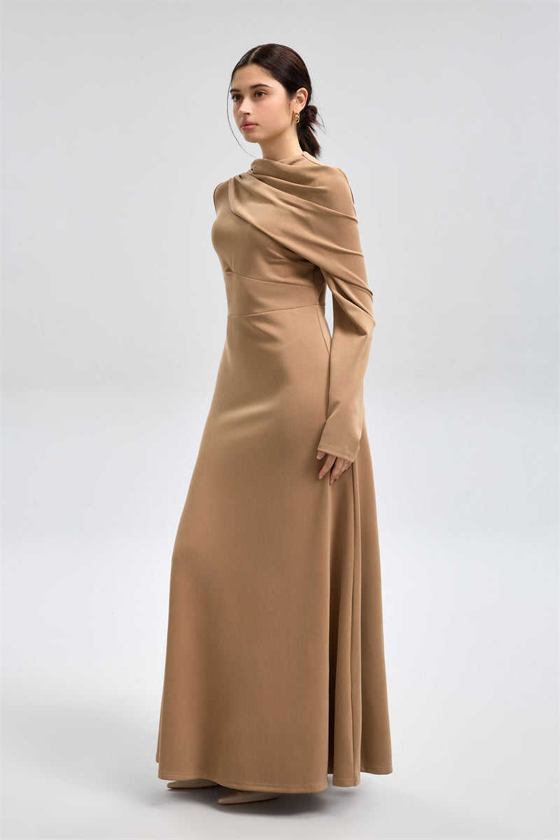 فستان ماكسي بتصميم راقٍ بقصّة انسيابية وتفصيل درابيّة ناعمة تمتد فوق الكتف مع ياقة عالية. يأتي بخصر محدد لإبراز القوام، وأكمام طويلة وتنورة واسعة تمنح إطلالة أنيقة وهادئة. قطعة فاخرة بلمسة بسيطة ومؤثرة للمناسبات المميّزة.