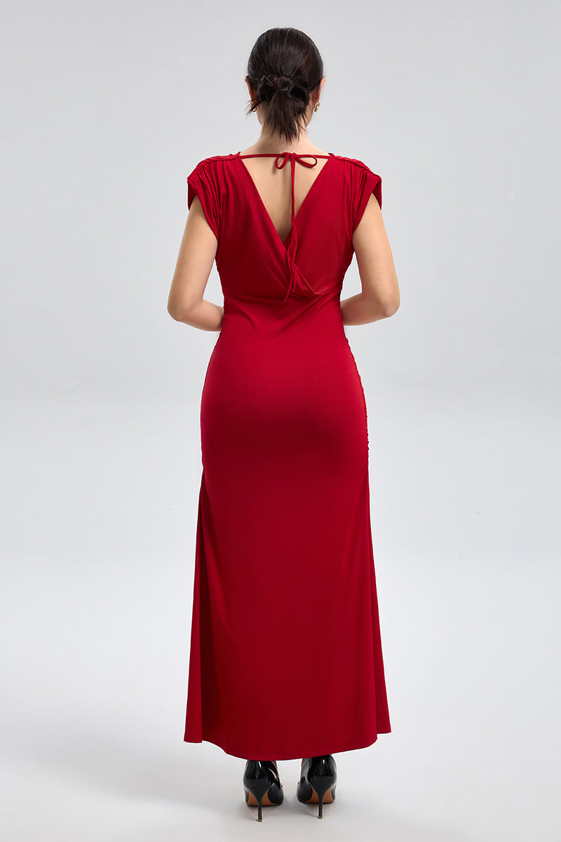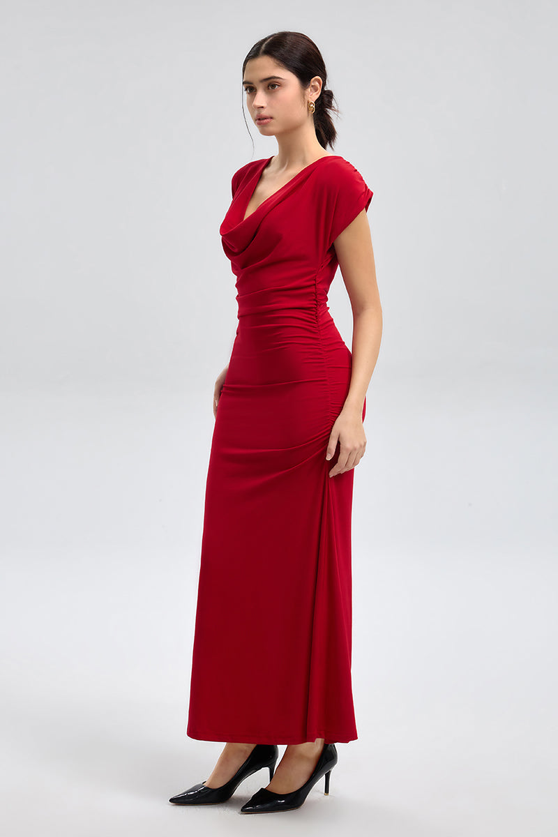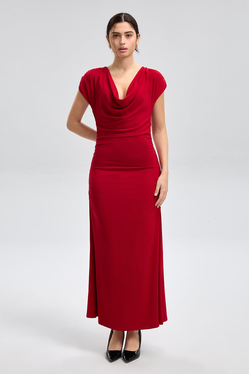 فستان طويل بقصّة منسدلة وفتحة ظهر