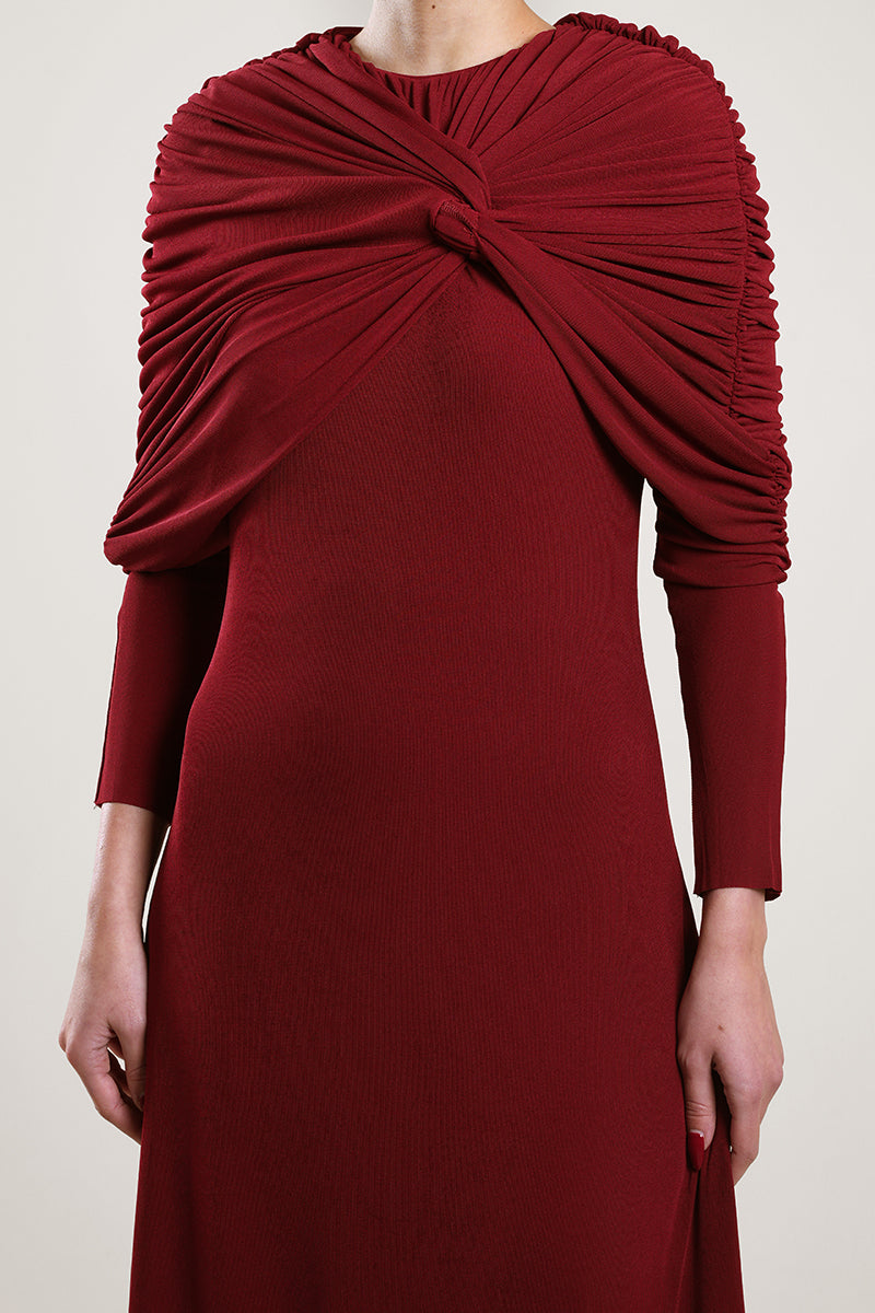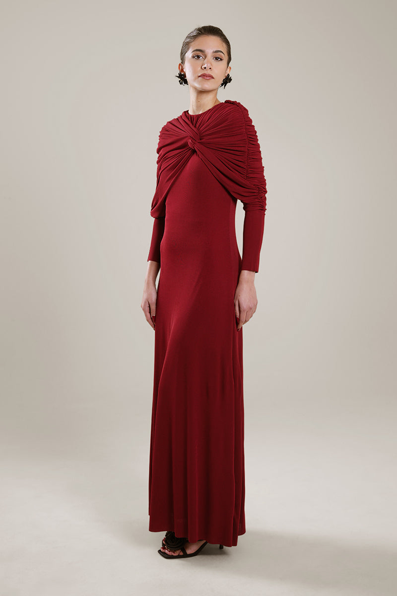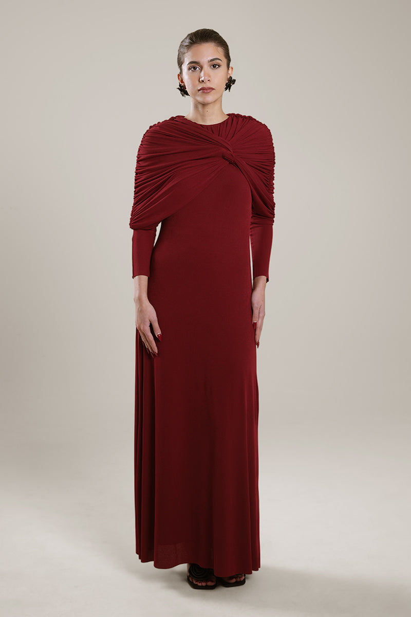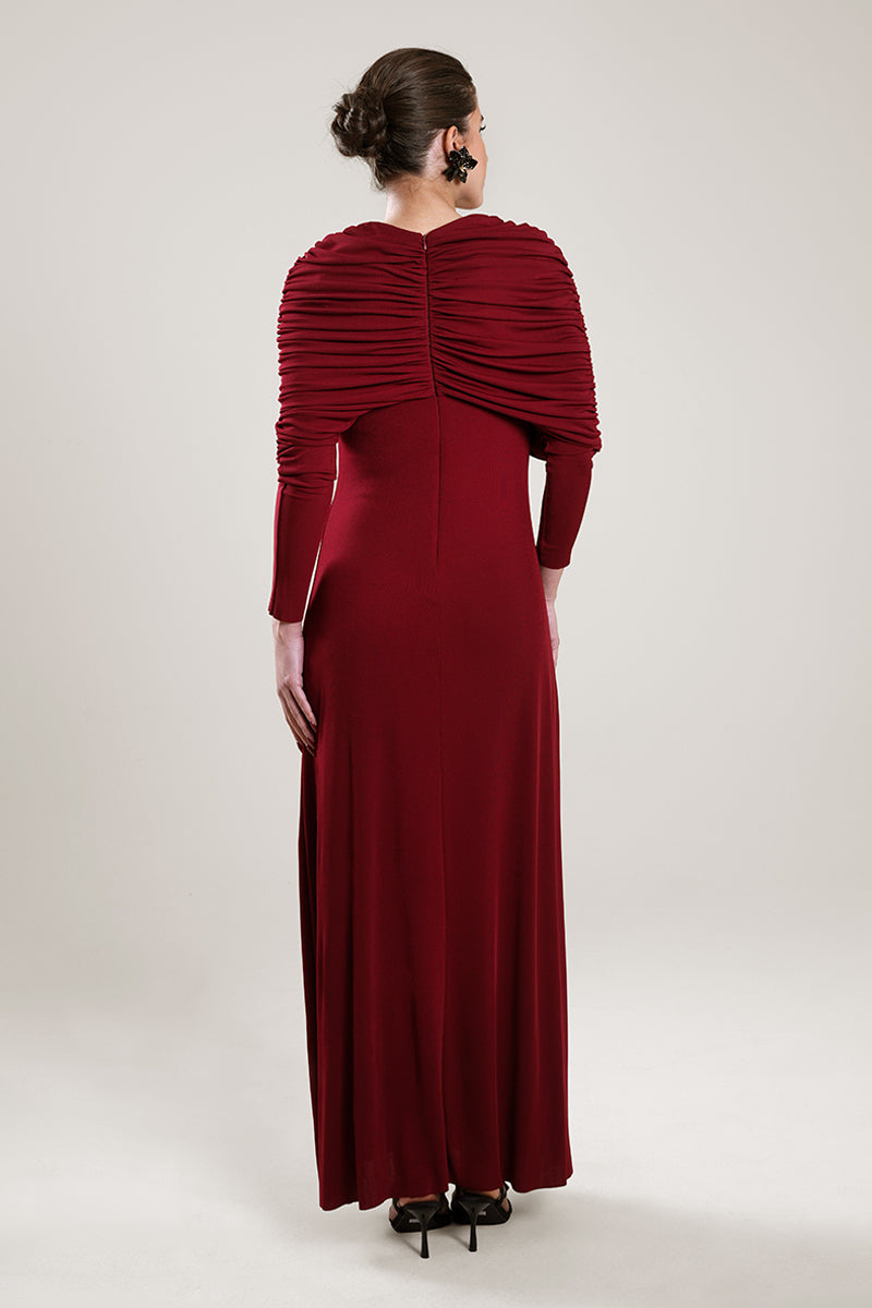 فستان سهرة أنيق بتفاصيل منسدله راقية عند الياقة والكتفين، مع أكمام طويلة تضيف توازناً وفخامة للتصميم. يتميز بقصة انسيابية تمنح مظهراً متناسقاً وحركة ناعمة، ليكون خياراً مثالياً للمناسبات الرسمية والسهرات.