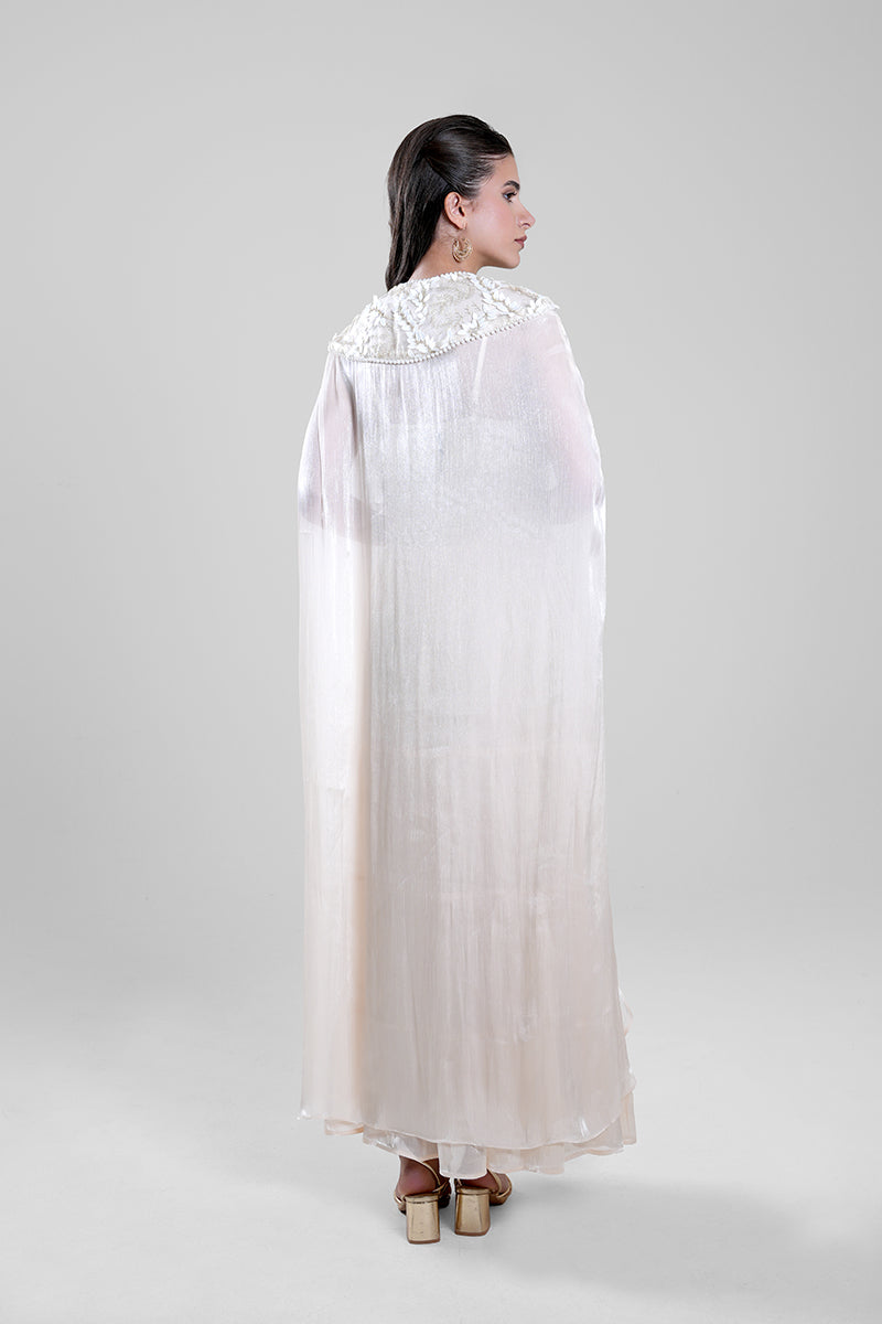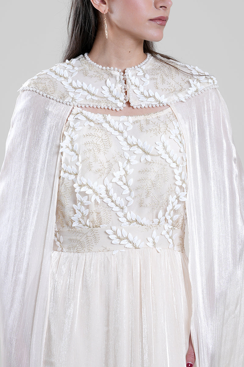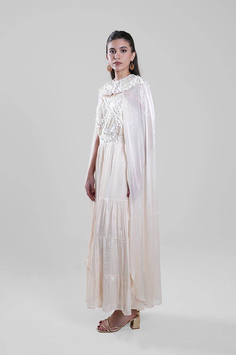 فستان طويل بتصميم أنيق، يتميز بجزء علوي مزخرف بتفاصيل تطريز دقيقة تضيف طابعاً مميزاً. يأتي مع طبقة خارجية شفافة تنسدل بسلاسة لتمنح الحركة بعداً ناعماً ومظهراً متوازناً. القصة الانسيابية تجعله مناسباً للمناسبات الرسمية واللقاءات الخاصة، مع حضور هادئ ولمسة راقية.