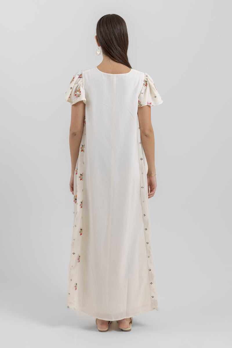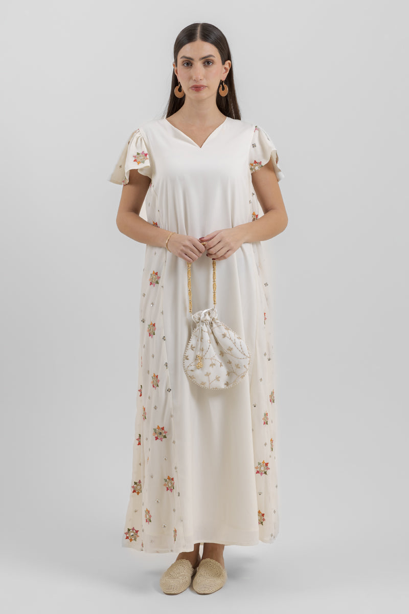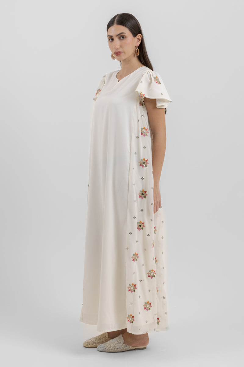 فستان بطول ماكسي يتميز بقصة انسيابية تمنح راحة وسهولة في الحركة. يأتي بياقة على شكل حرف V ناعمة وأكمام قصيرة منسدلة تضيف لمسة خفيفة. تتزين الجوانب بتفاصيل تطريز دقيقة تضيف عمقًا بصريًا مع الحفاظ على طابع محتشم وأنيق. مناسب للاستخدام اليومي، المناسبات البسيطة، والإطلالات الهادئة.