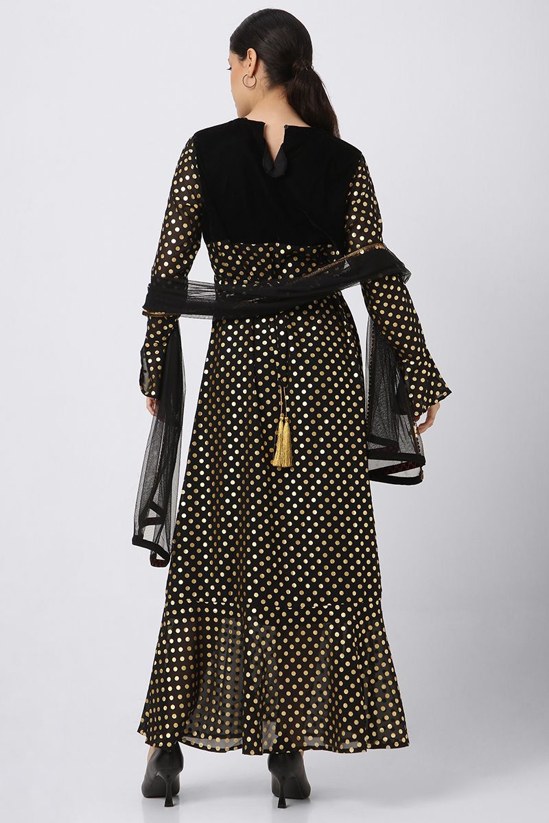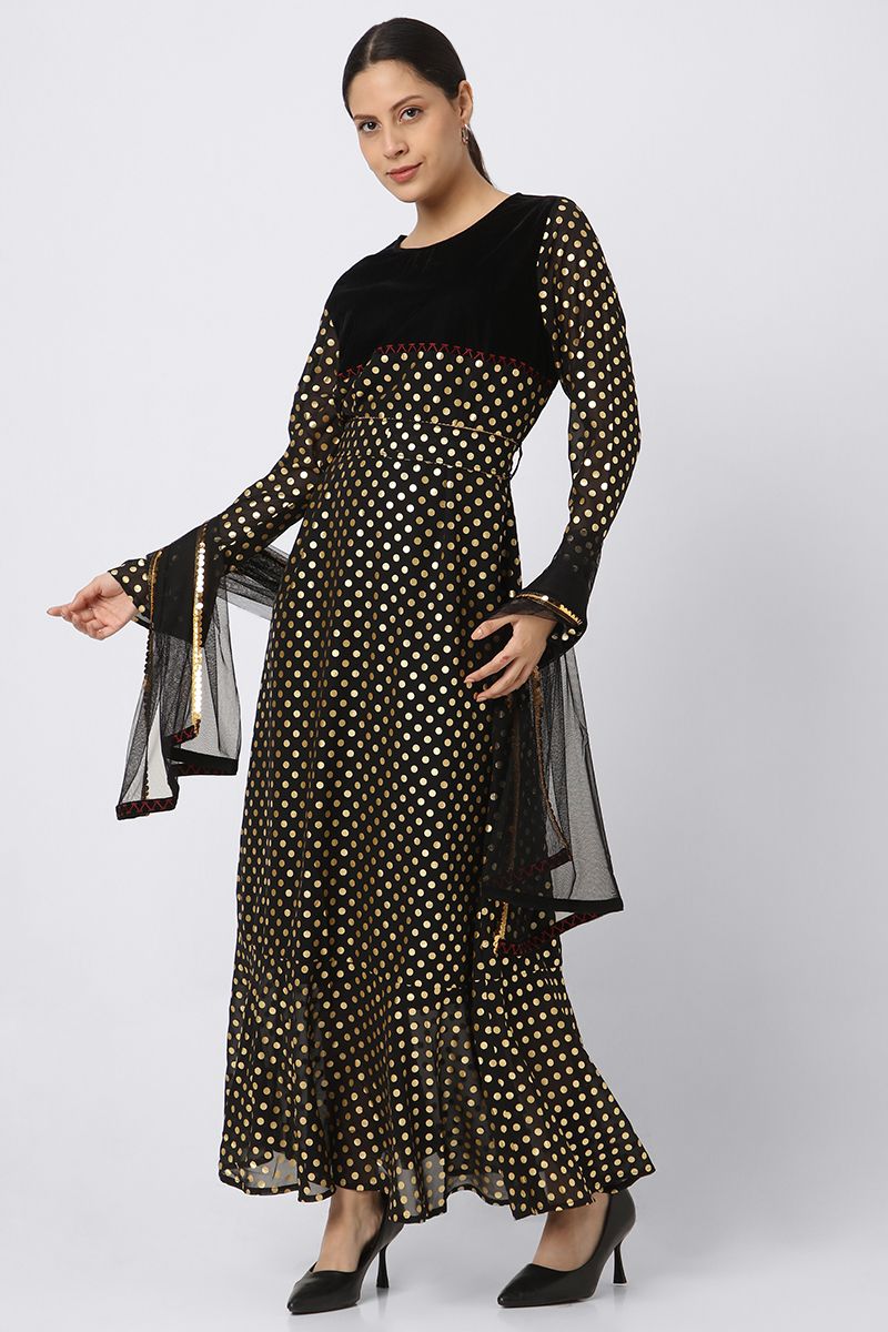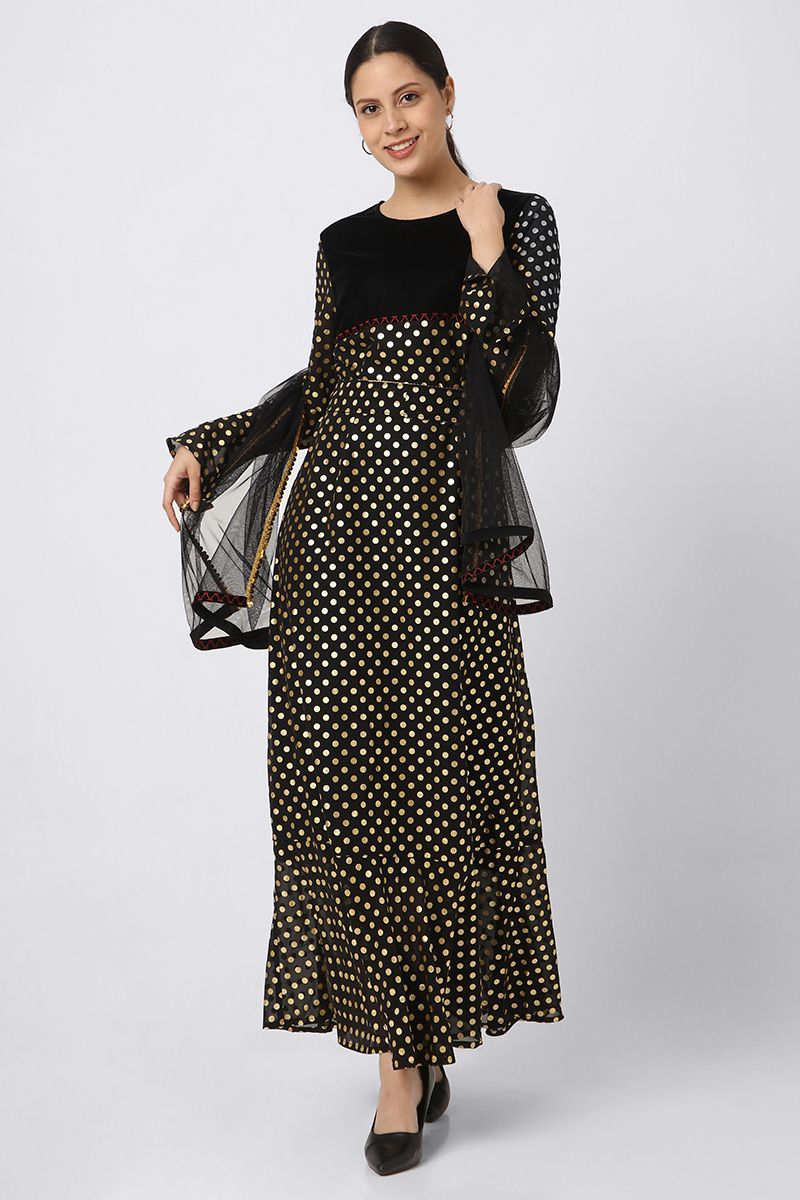 مزين بنمط طبعات ذهبية اللون على كامل التصميم وتفاصيل خامة مخمل على الجزء العلوي