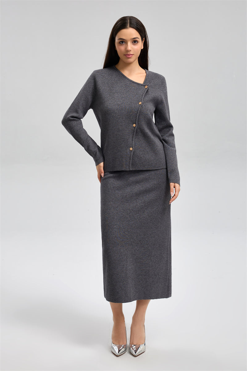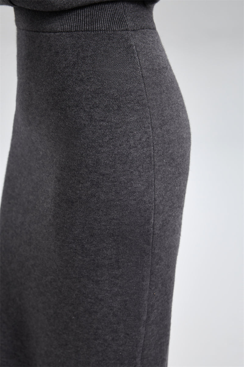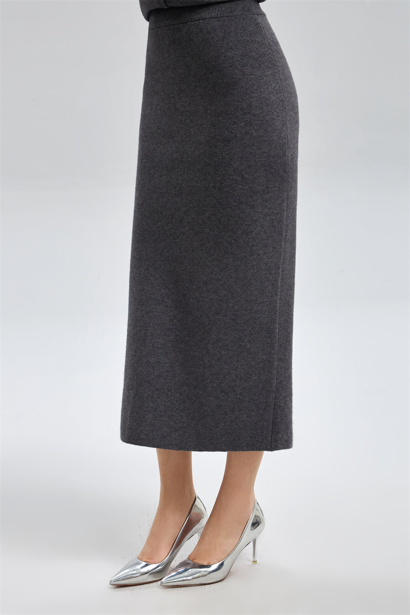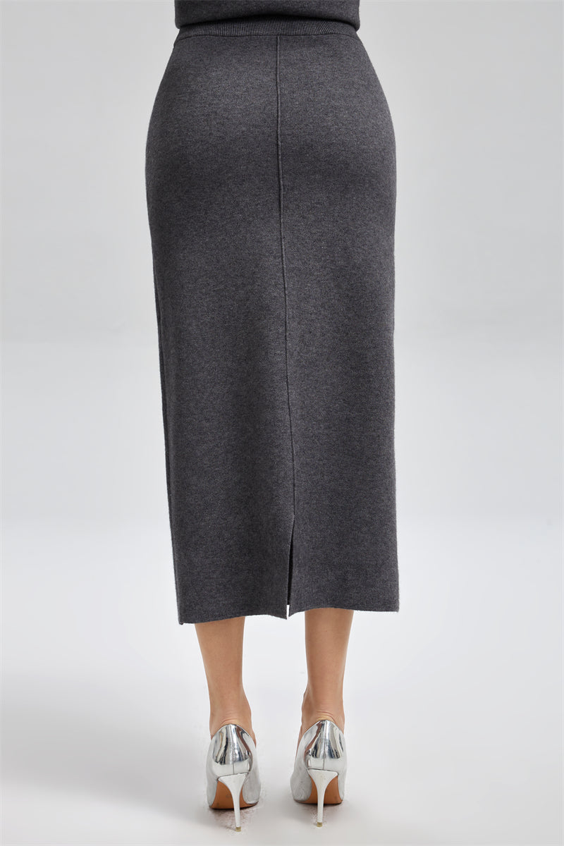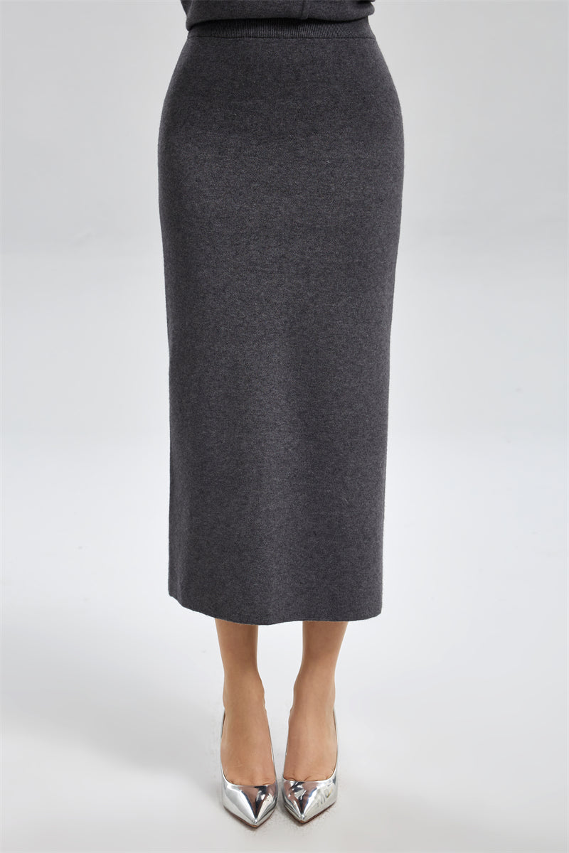 تنورة محبوكة بقصّة مستقيمة تضيف مظهراً أنيقاً وبسيطاً في آن واحد، مع فتحة خلفية تمنح راحة إضافية أثناء الحركة. خامة ناعمة ومرنة تمنح انسيابية وتناسقاً مع القوام، ويمكن تنسيقها بسهولة مع بلوزة محبوكة أو قطع كلاسيكية لإطلالة عملية ومهذبة.