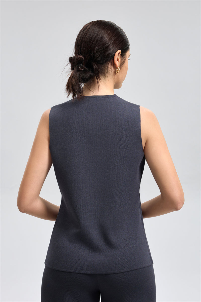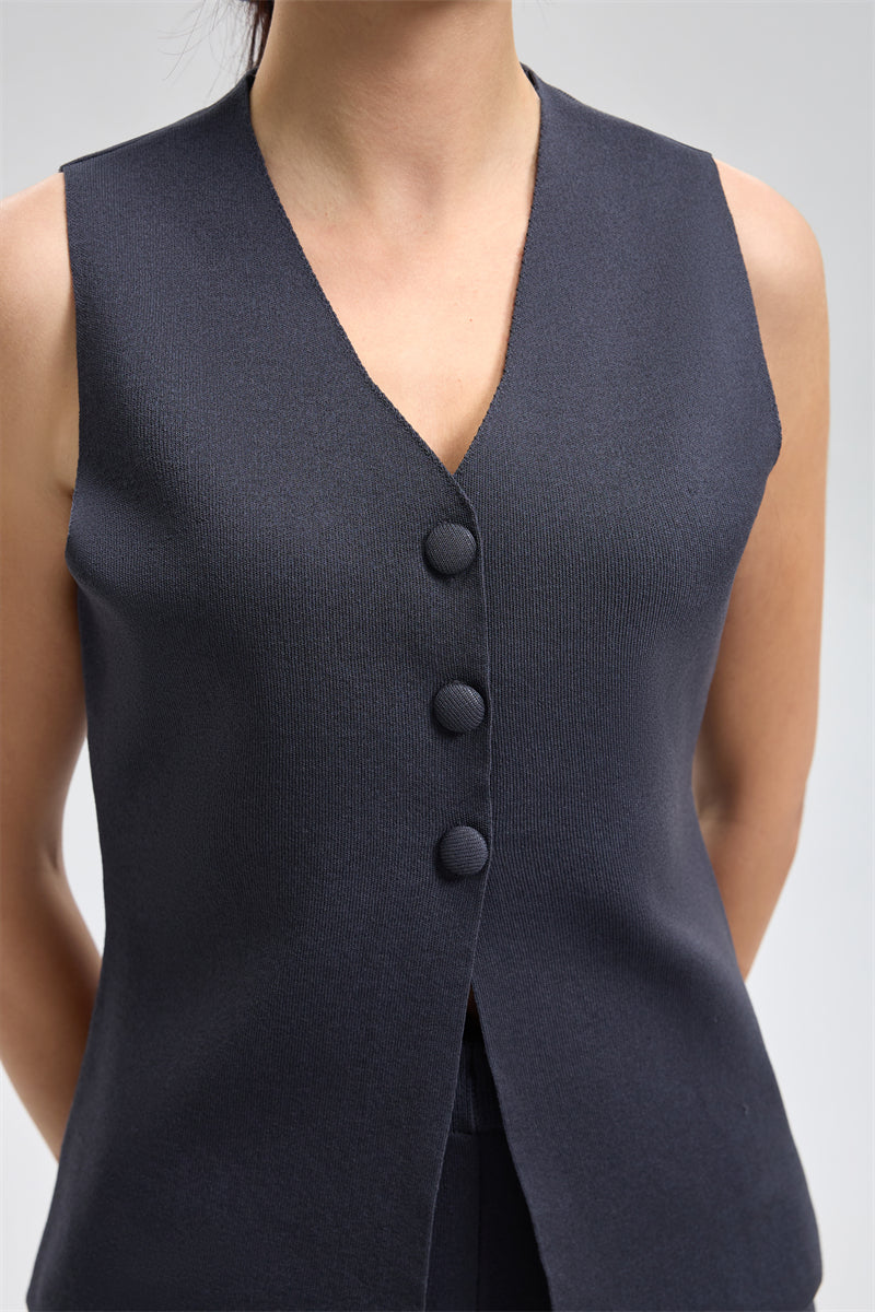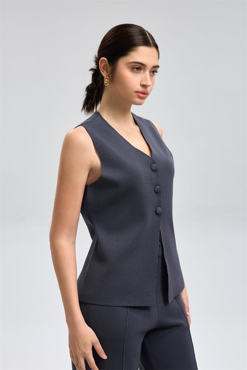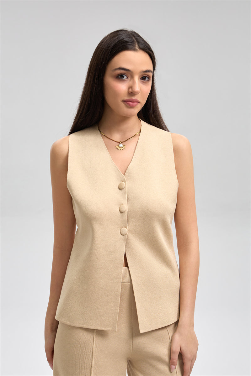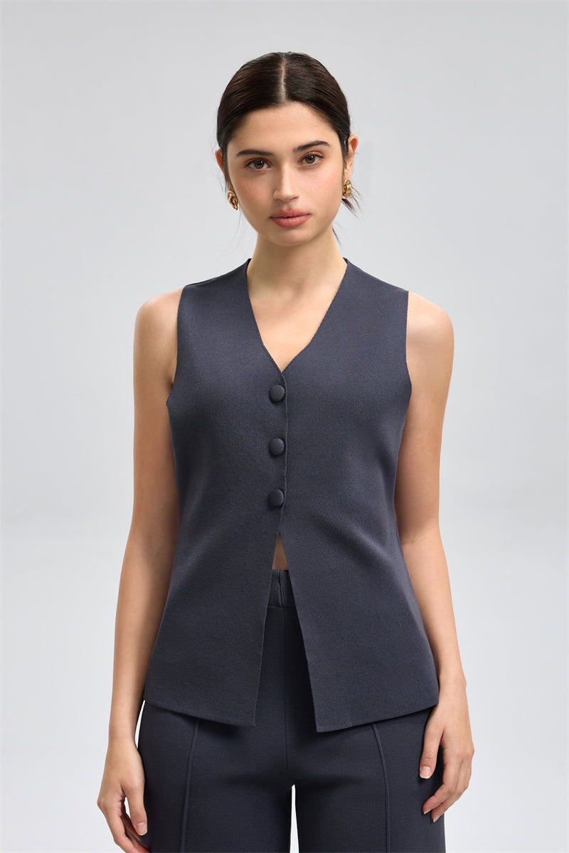 فيست محبوك بتصميم ناعم وخفيف، مزوّد بياقة بشكل V وأزرار أمامية مغطّاة تمنح لمسة مرتّبة وبسيطة. قصّة مستقيمة ومريحة تجعلها خيارًا مثاليًا للتنسيق مع قطع مختلفة أو مع بنطال محبوك لإطلالة متناسقة وأنيقة.