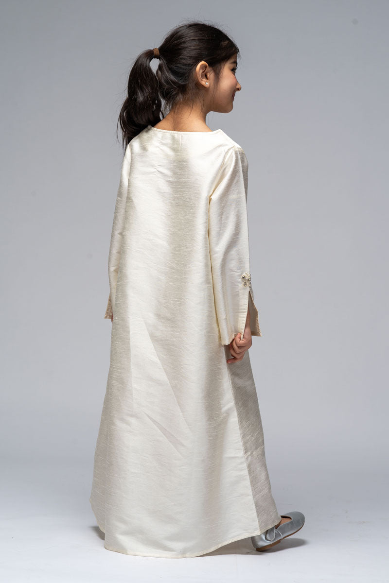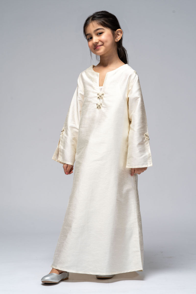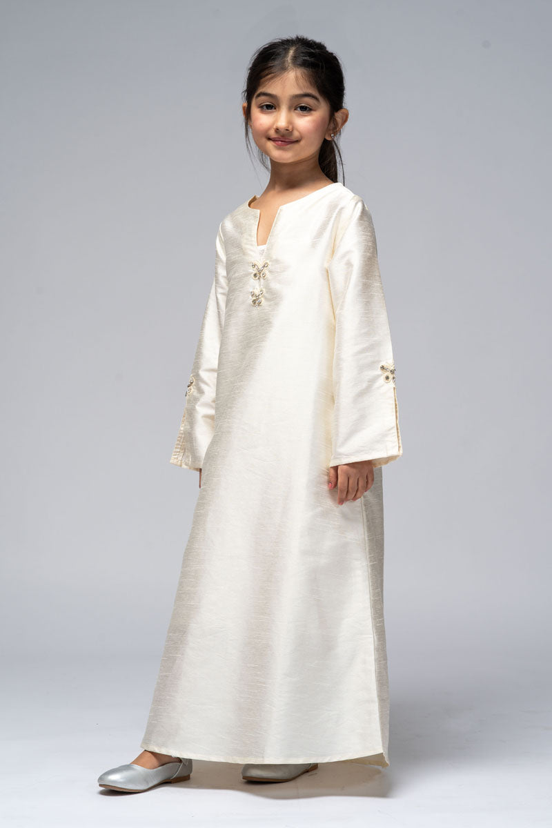 فستان طويل بتصميم أنيق وقصة مستقيمة، يتميز بتفاصيل مطرزة ناعمة في الجزء الأمامي ولمسات زخرفية على الأكمام. يوفر راحة في الحركة ومظهراً متوازنًا، مناسب للمناسبات المختلفة والارتداء اليومي.