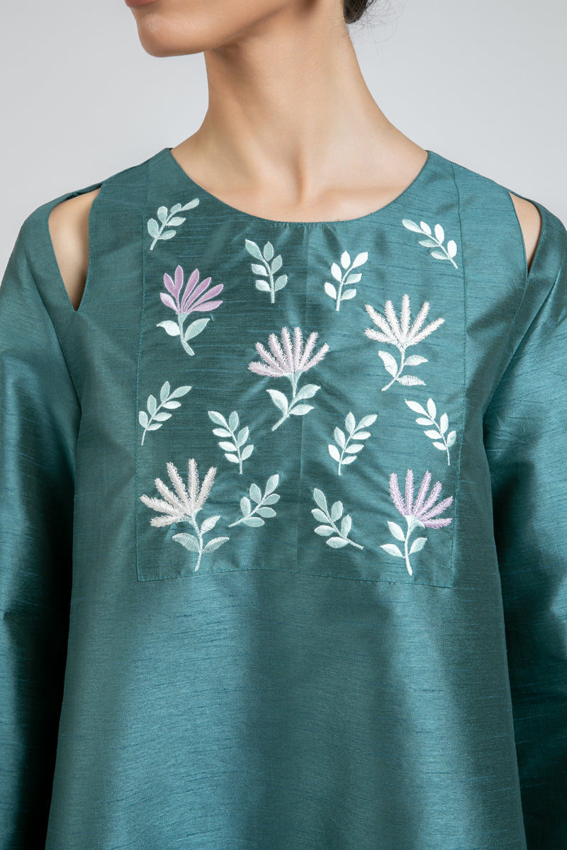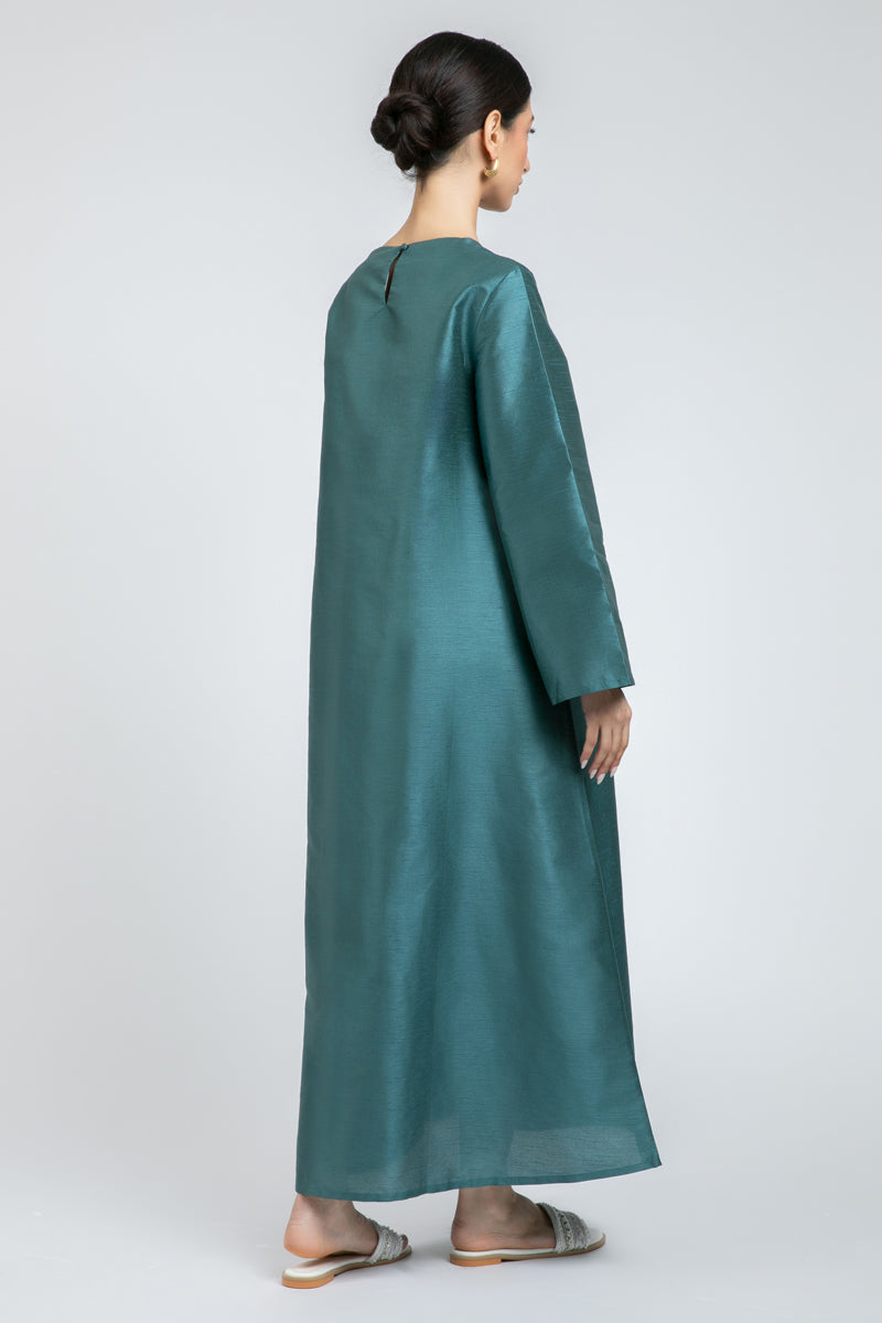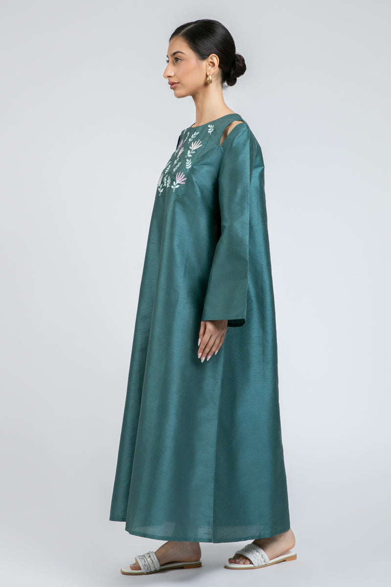 فستان طويل بتصميم انسيابي وقصة مريحة، مزين بتطريز ناعم على الصدر مع فتحات كتف بسيطة تضيف لمسة عصرية هادئة. يتميز بأكمام واسعة تمنح حرية حركة ومظهراً أنيقاً، مناسب للاستخدام اليومي والمناسبات البسيطة.