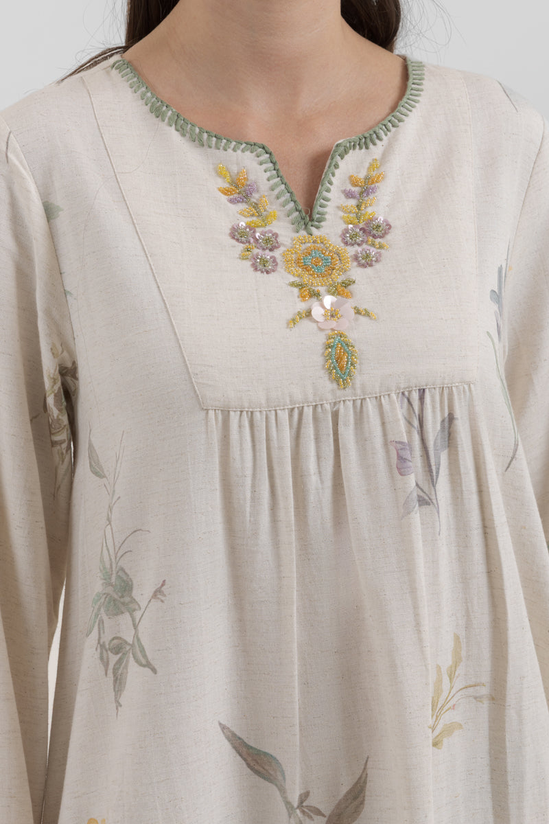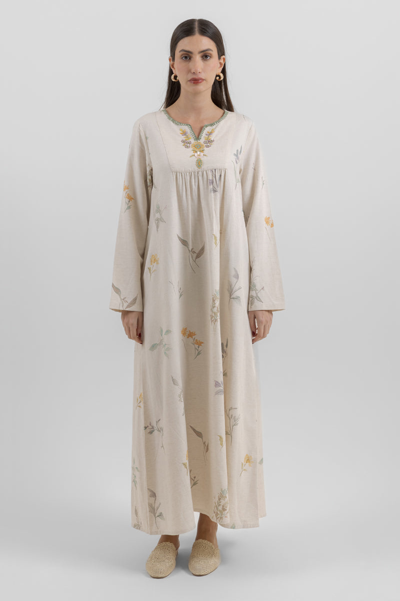 فستان طويل بقصة واسعة ومريحة، يتميز بطبعة زهور ناعمة وتطريز خفيف عند فتحة الرقبة. تصميم عملي بأكمام طويلة وانسيابية تمنح حرية حركة ومظهراً هادئاً، مناسب للاستخدام اليومي والمشاوير البسيطة.