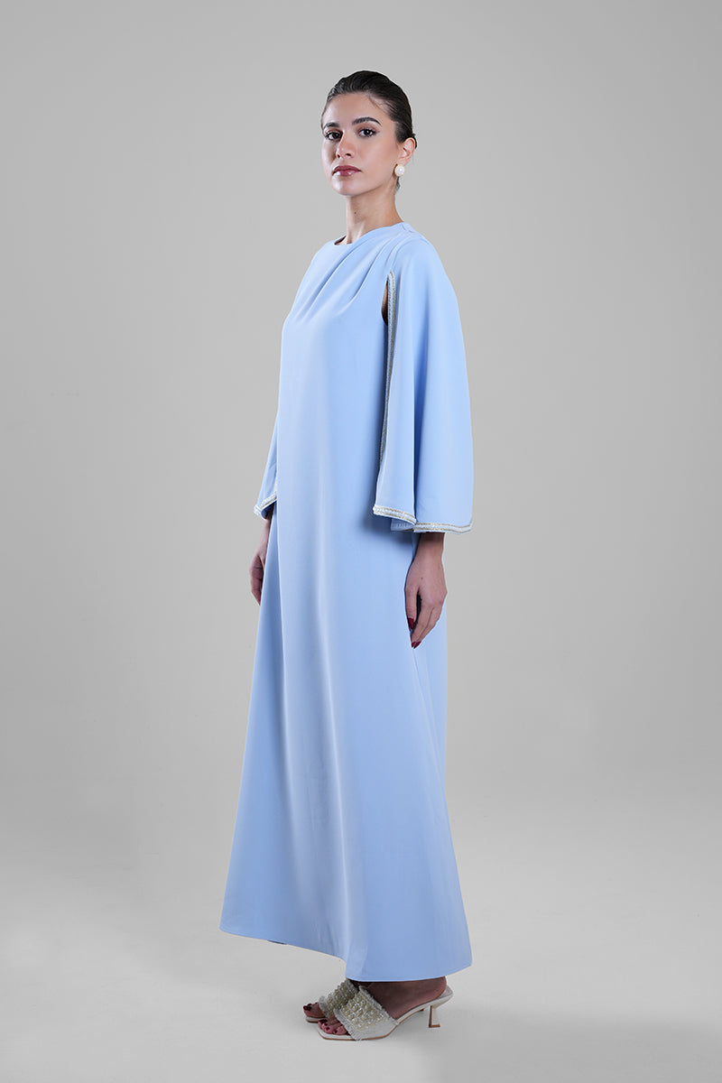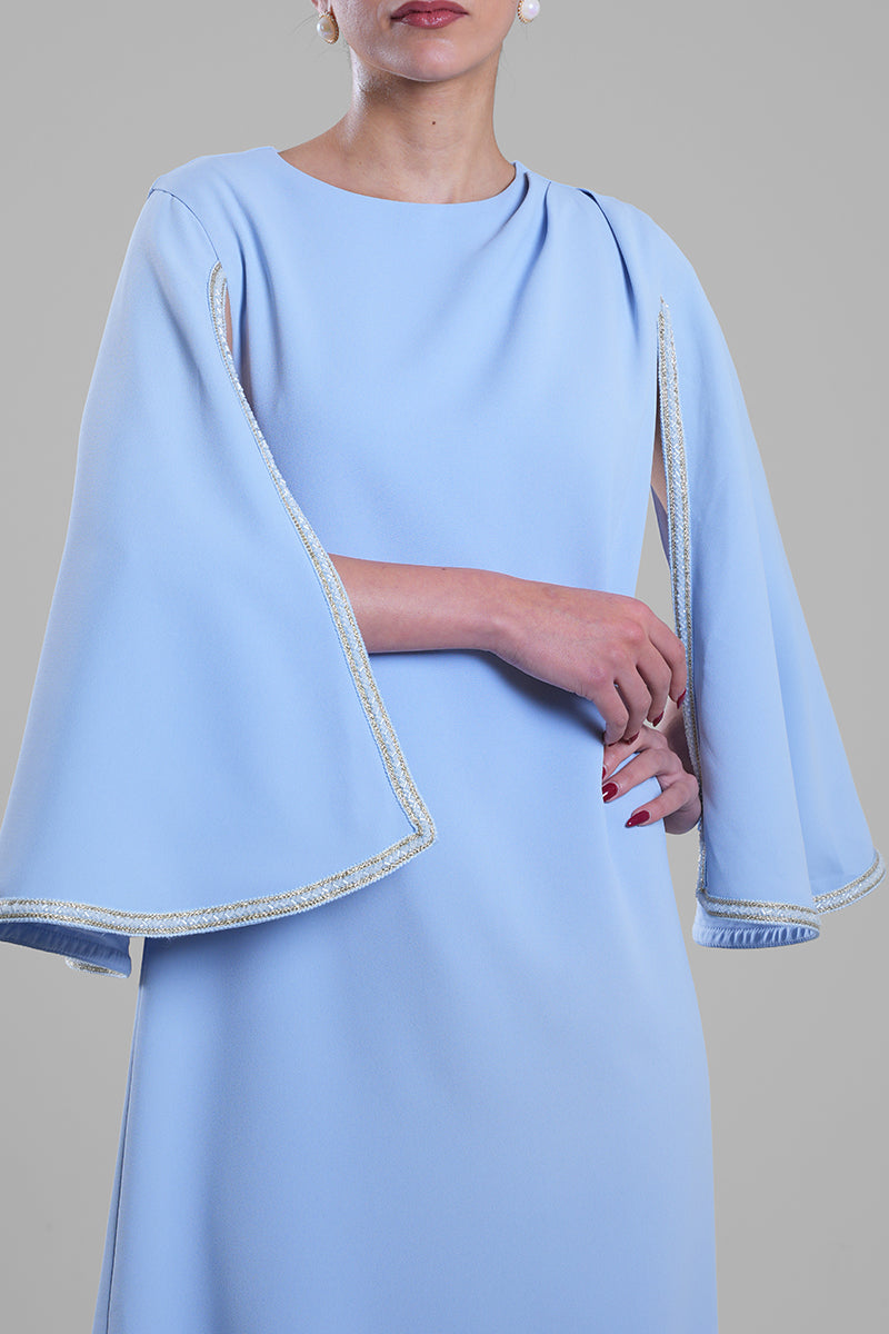 فستان بطول كامل بقصة انسيابية ناعمة، يتميز بأكمام كيب مع فتحات مشقوقة تضيف بعدًا أنيقًا للتصميم. حواف الأكمام مزينة بتفاصيل دقيقة تمنح الفستان لمسة راقية وحركة متوازنة. مناسب للمناسبات الرسمية والسهرات واللقاءات الراقية.