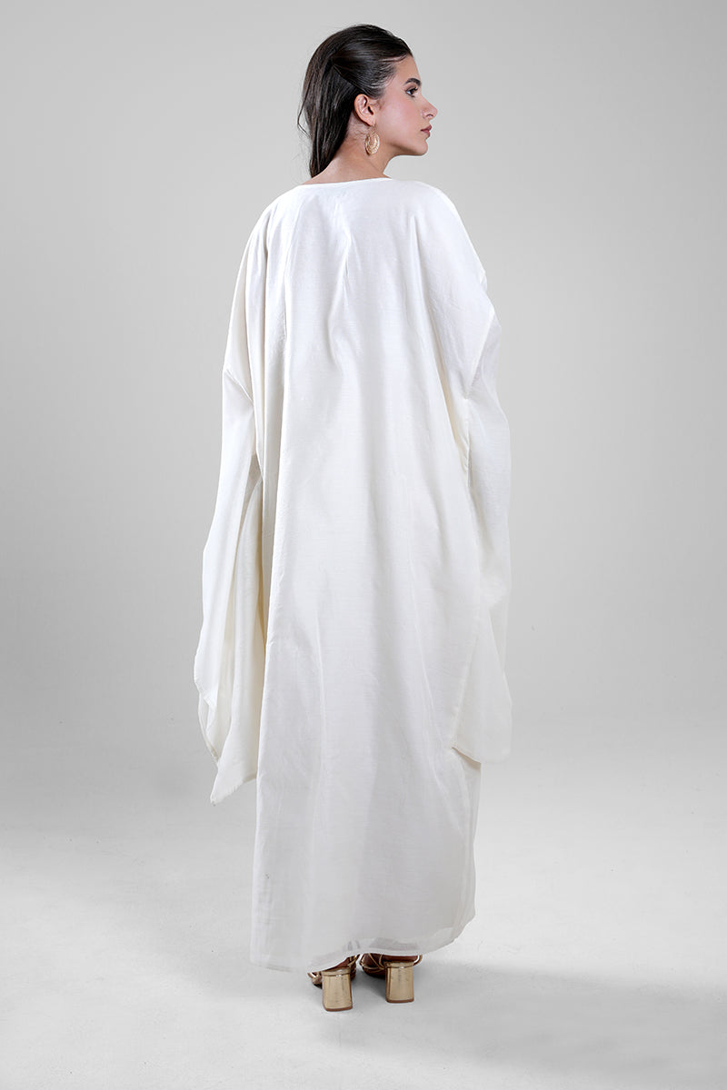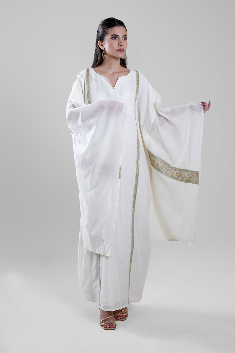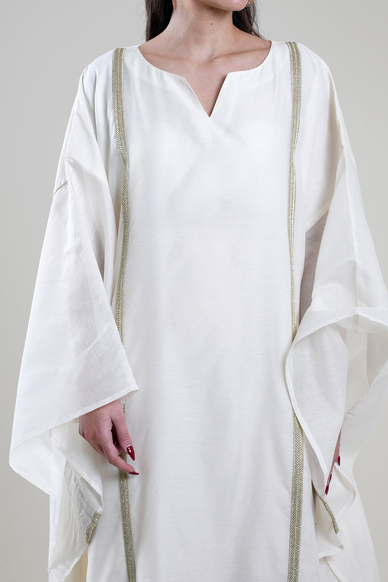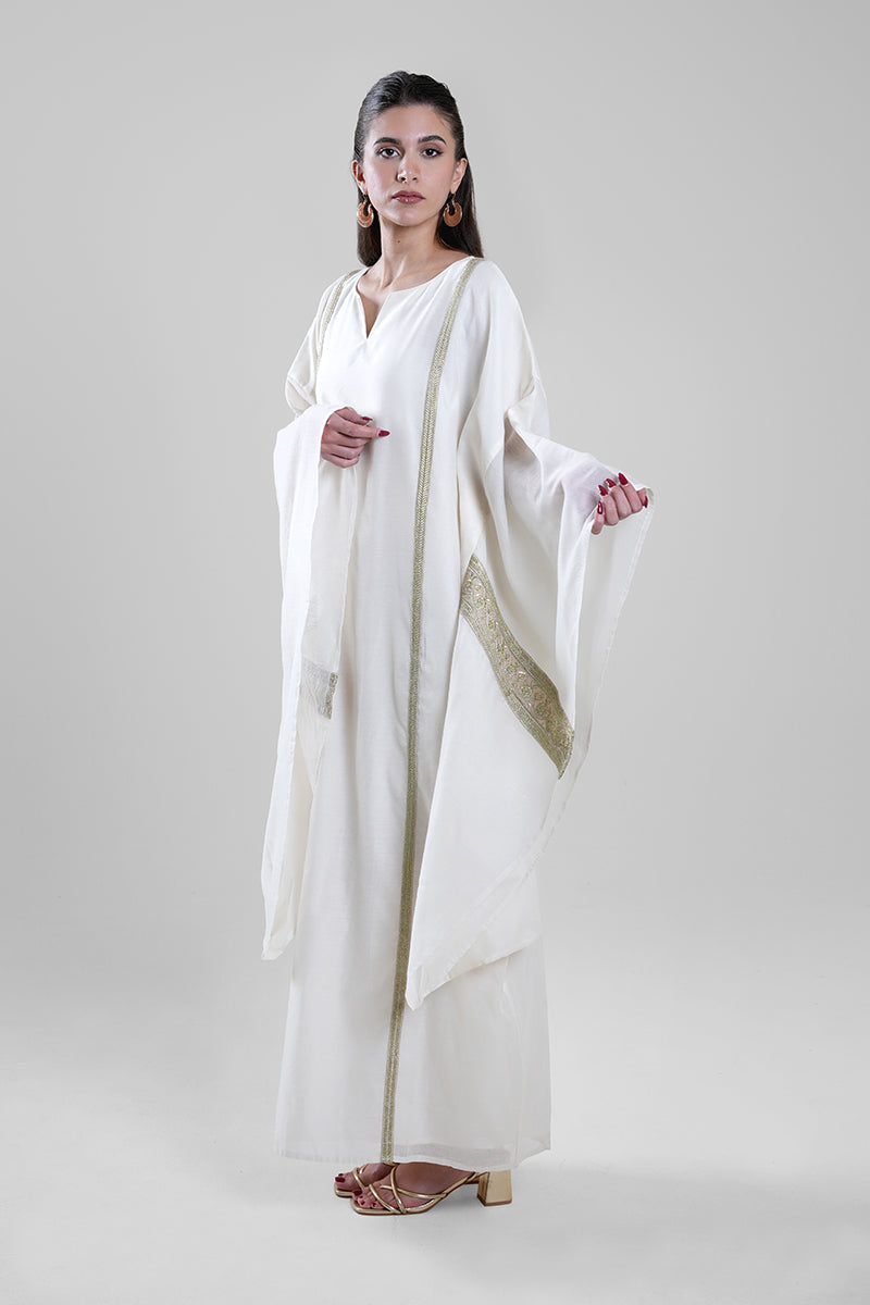 فستان طويل بتصميم انسيابي وقصة واسعة تمنح راحة عالية وحركة سلسة. يتميز بأكمام واسعة وتفاصيل زخرفية دقيقة على الحواف تضيف لمسة راقية دون مبالغة. تصميم عملي يناسب الإطلالات الهادئة والمناسبات المرتبة.