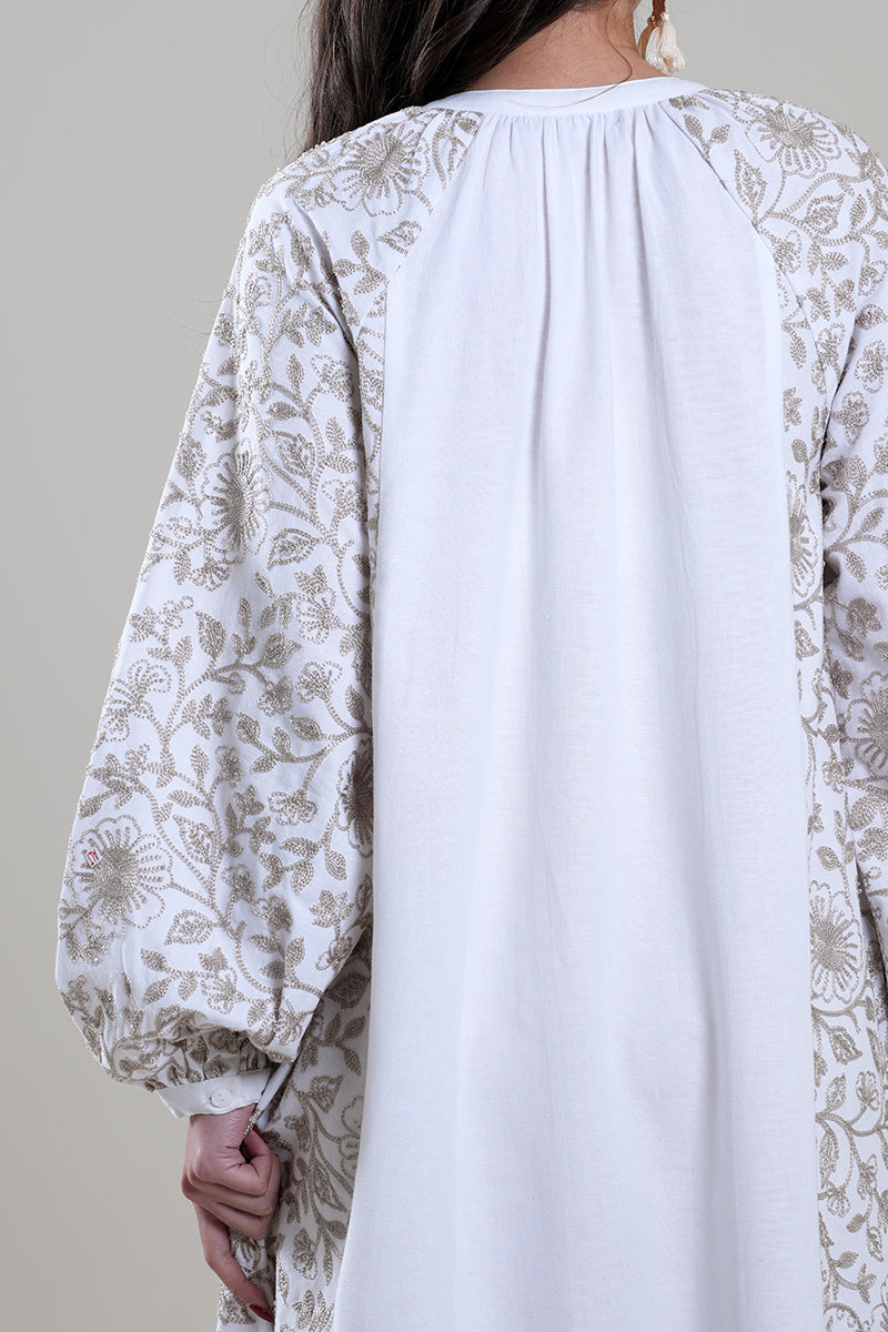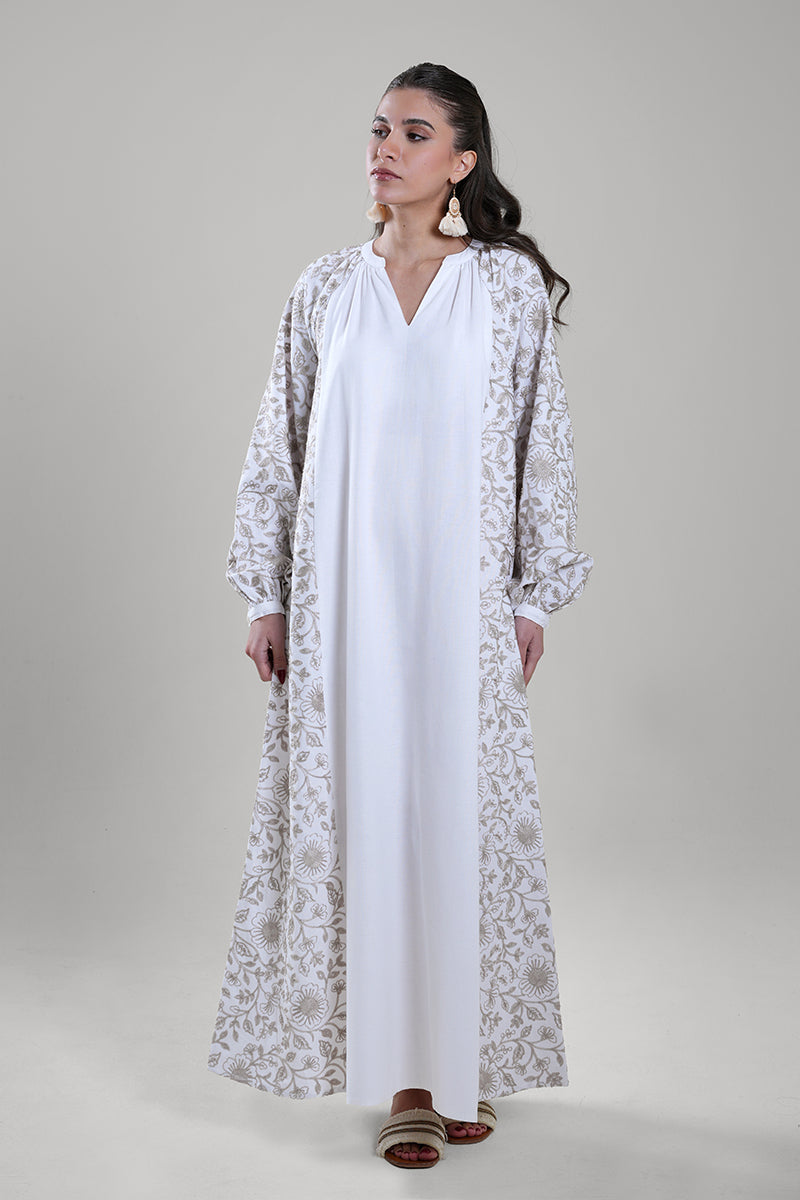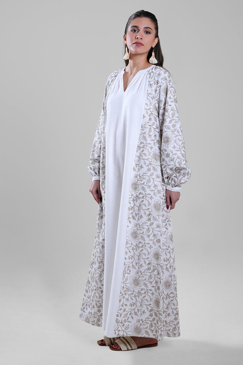 فستان طويل بتصميم أنيق يجمع بين طبقتين بقصة انسيابية مريحة. يتميز بتفاصيل نقش دقيقة تضيف عمقًا بصريًا دون مبالغة، مع قصة مستقيمة تمنح مظهرًا متوازنًا وسهل الارتداء. مناسب للإطلالات الهادئة والمناسبات المرتبة.