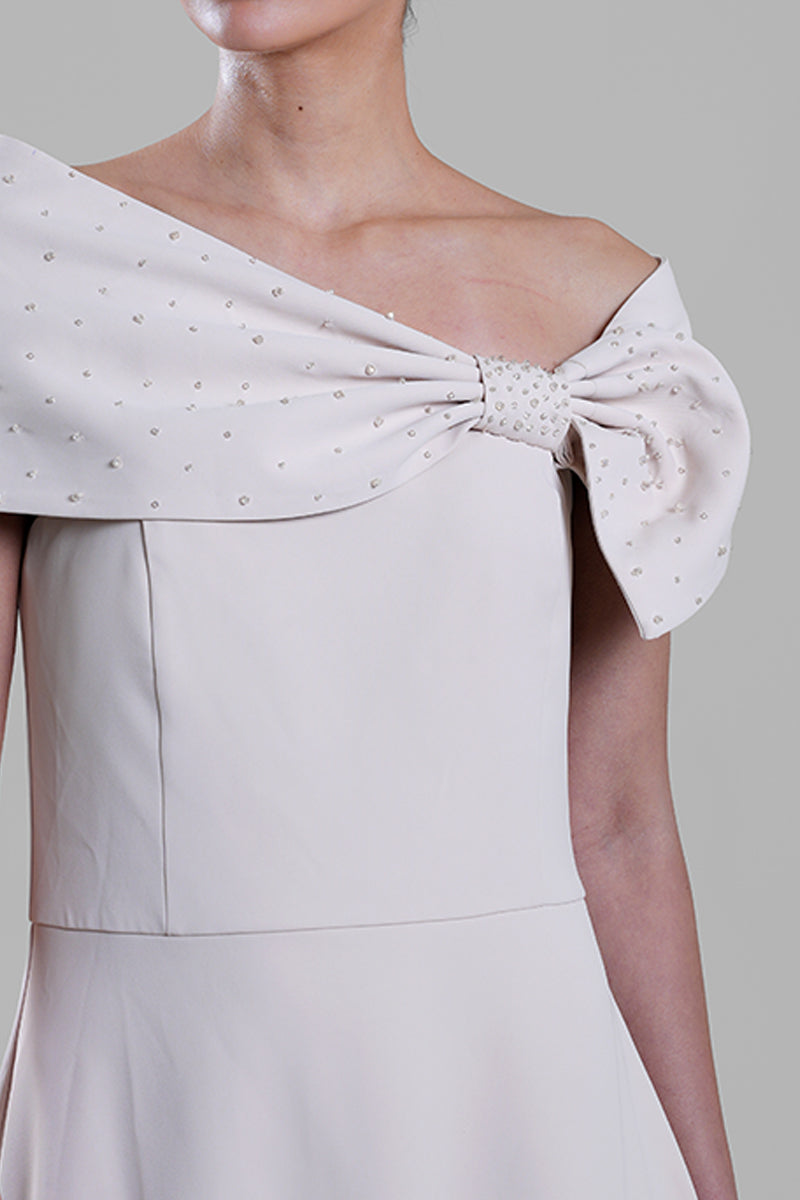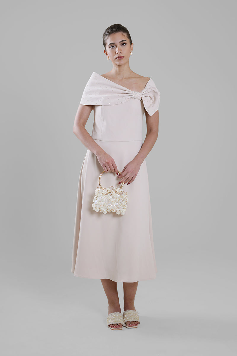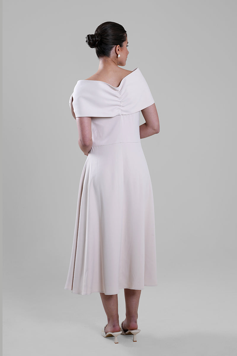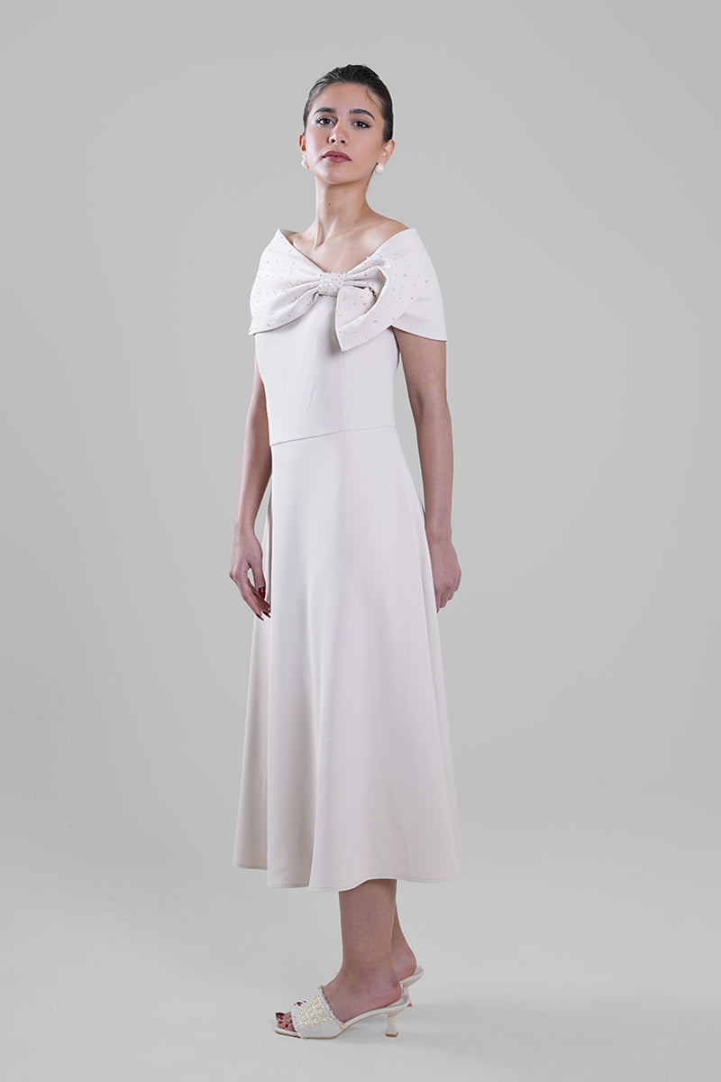 فستان بطول ميدي يتميز بقصة منظمة وياقة واسعة مزينة بعقدة بارزة تضيف طابعًا أنيقًا للتصميم. يأتي بجزء علوي متناسق ينسدل إلى تنورة بانسيابية ناعمة تمنح توازنًا في الحركة ولمسة راقية. مناسب للمناسبات الرسمية والسهرات واللقاءات الخاصة.