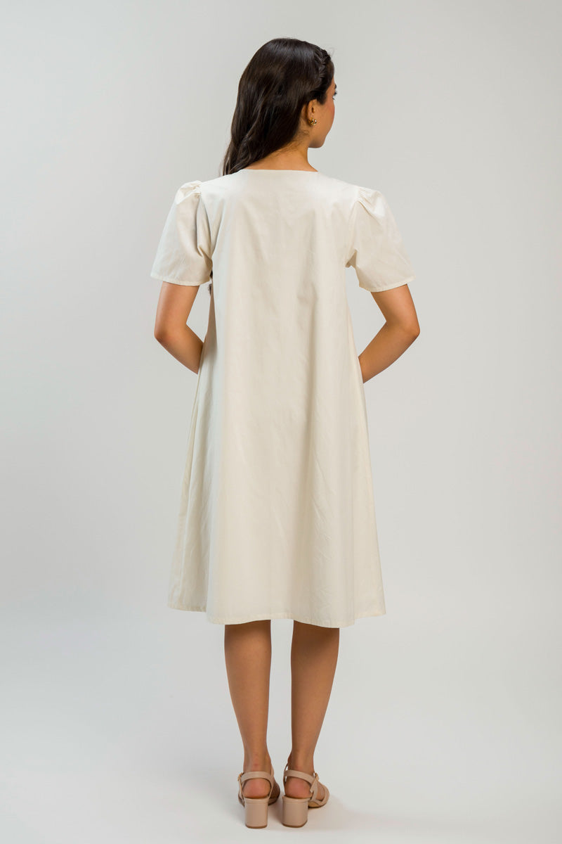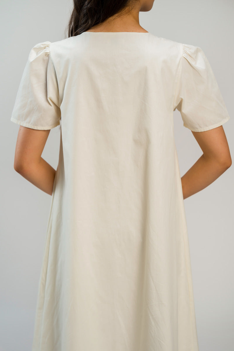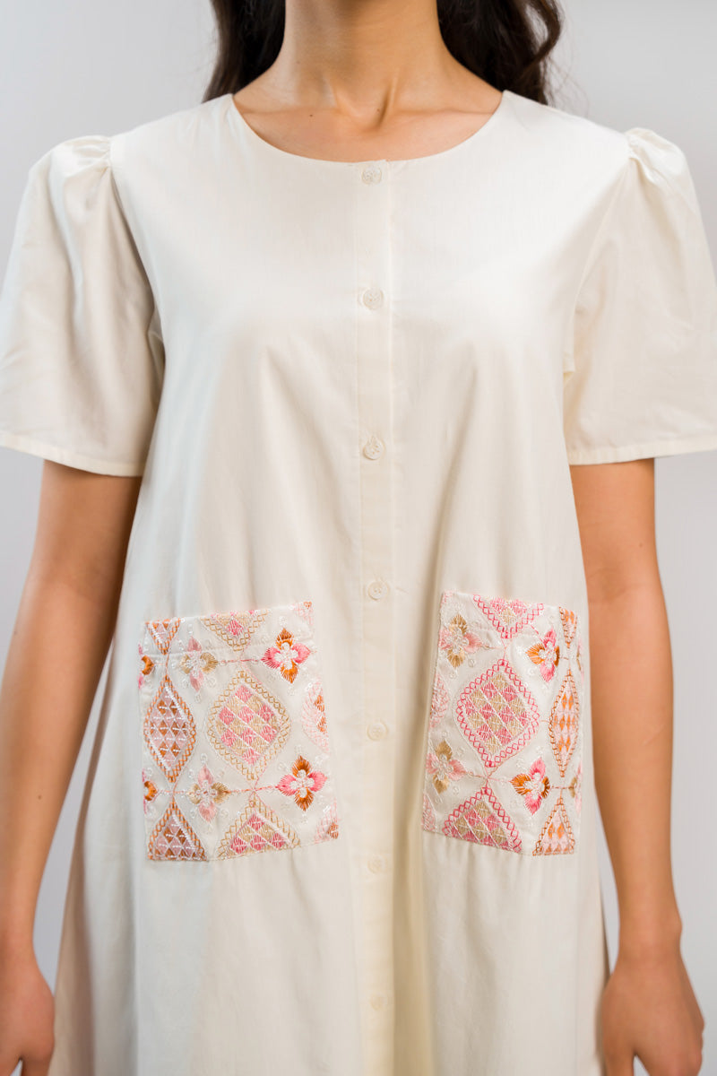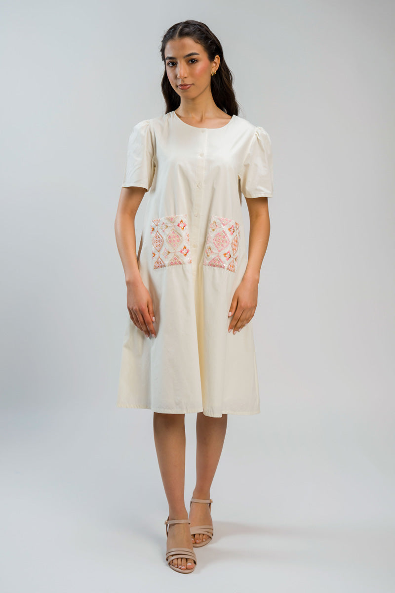 فستان ميدي بتصميم عملي وأنيق، يتميز بأكمام قصيرة وقصة مستقيمة تمنح راحة في الارتداء. يأتي بأزرار أمامية تضيف لمسة كلاسيكية، مع تفاصيل تطريز ناعمة على الجيوب الأمامية تعزز الطابع الجمالي للتصميم. مناسب للاستخدام اليومي ويمنح مظهراً متوازناً بين البساطة والأناقة.